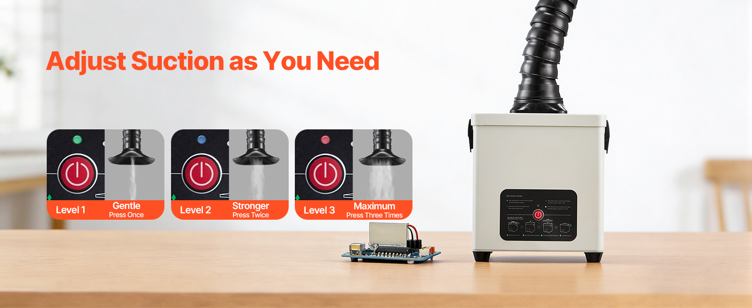 - Aspirazione personalizzabile e utilizzo intuitivo: tre opzioni di flusso d'aria disponibili, con una capacità massima di 180 m³/h. È possibile regolare facilmente l'intensità dell'aspirazione per adattarla a diverse esigenze di saldatura e quantità di fumo, assicurando un funzionamento stabile, fluido ed efficace.