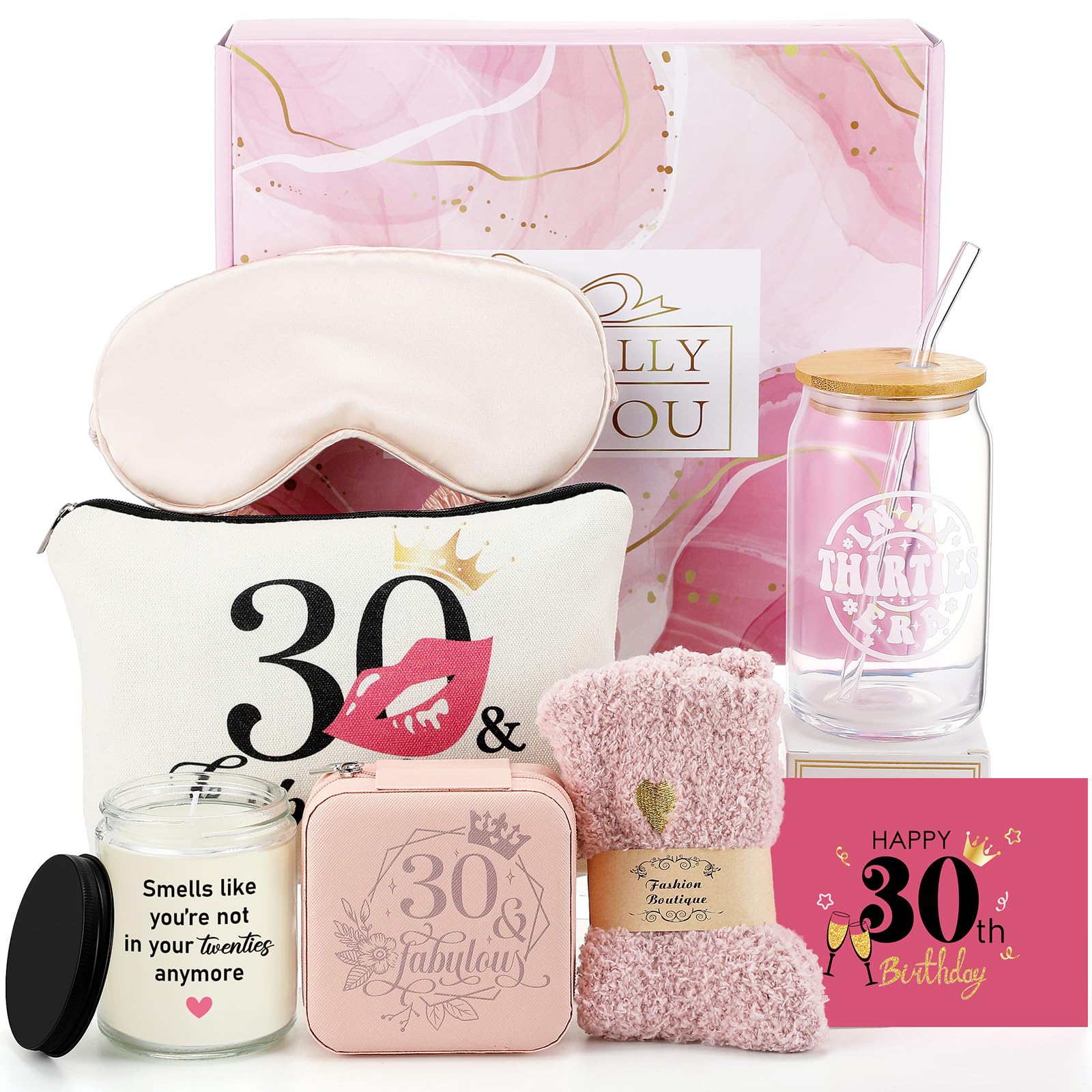 - 30th Birthday Gifts for Women: our gifts for 30th birthday women include scented candles, cosmetic bags, travel jewelry boxes, plush socks, gift cards, eye masks, In My Thirties Era cup, they are all packed in a beautiful gift box, no need to wrap