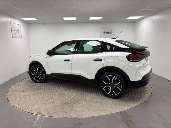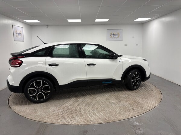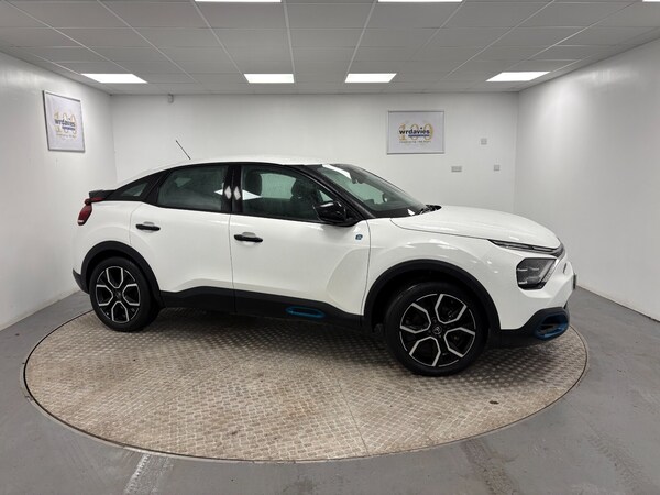 ..10'' high resolution touchscreen user interface, controlling media, connectivity and vehicle settings, 5.5 inch backlit full TFT driver's instrument cluster with LED ambient lighting, Apple car play and Android auto, Citroen connect box emergency and assistance system, Citroen connect nav with speed cam and danger zones alert, Coffee Break Alert, Cruise control + speed limiter, Driver's head-up display, Electronic Power Steering (EPS), In-crash braking, Rear parking sensors, Top rear vision reversing camera, Voice commands, 7.4 kW single-phase onboard charger, Mode 3 charging cable with Type 2 connectors - for accelerated charging from wall boxes and dedicated public charging points, Suspension with progressive hydraulic cushions - double hydraulic stops on front suspension and single on rear suspension, 6 speakers, Auxiliary input socket, Bluetooth telephone and audio streaming, DAB Digital radio, 3rd brake light, Automatic headlights, Body colour bumpers, Body colour door handles, Body colour painted external rear view mirrors, Electrically heated, folding and adjustable external rear view mirrors with courtesy lighting, Front and rear electric windows, Gloss black rear skirt, LED daytime running lights in V signature, LED front fog lamps with static cornering function, LED front headlamps, Rain sensing automatic front windscreen wipers, Rear side wing doors, Rear wiper, Standard interior rear-view mirror with manual day-night switching, Welcome and goodbye lighting, 12V power outlet, 1x USB Type-C socket charging & data connection and 1x USB Type-A socket in 1st row and 1x USB Type-A socket charging in 2nd row, 3 individual rear seats, 3 rear headrests, Boot light, Chevrons cloth and leather effect textile seat upholstery, Dashboard tray in front cabin, Driver and passenger sunvisors with illuminated vanity mirrors, Dual zone automatic air conditioning, Front and rear LED interior lighting, Front head restraints, Grained leather steering wheel with two command blocks, Height adjustable driver's seat with adjustable lumbar support, Height adjustable front passenger seat, Height and reach adjustable steering wheel, Map pockets in rear of front seats, Raised centre console with armrest and two cup holders, Remote temperature pre-conditioning, Single front passenger seat, Split folding rear seats, High level acoustic insulation pack - C4/C4 X/e-C4 X, 3x3 point rear seatbelts, ABS, Driver and front passenger airbags, Electric parking brake, ESP, Front