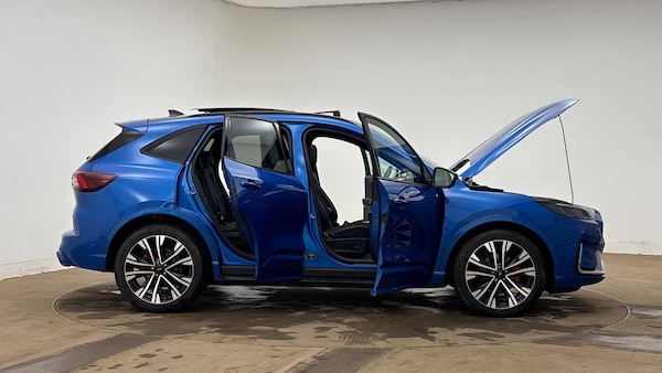 3x3 point rear seatbelts, Airbags - front driver/passenger, front and rear curtain, Drivers knee airbag, Dynamic brake support, Electronic stability control (ESC) and ABS, Evasive steering assist, Ford MyKey Gen 2 safety system, Manual child proof rear door locks, Pre collision assist with autonomous emergency braking, Rear seat Occupancy alert, Red brake calipers, Tyre pressure monitoring system, 12.3 inch digital colour instrument cluster, 360 degree view camera, Clear exit assist, Cross traffic alert with active braking, e-Call (emergency call), Ford easy fuel, Ford SYNC 4 Navigation with 13 inch touchscreen, DAB radio, emergency assistance, Andriod Auto/Apple CarPlay, 5G modem and Ford Pass connect, Front and rear parking sensors, Hands free power tailgate, Lane centering assist, Lane keeping aid with lane departure warning, Power assist steering, Selectable drive modes, Service interval indicator, Auto headlamps with high and low beam, Black roof rails, Body colour bumpers, Front LED fog lamps, Full LED headlamps, Large rear spoiler, LED daytime running lights, LED rear lights, LED third brake light, Pop out door edge protectors, Power front/rear windows with global close, Power heated folding door mirrors with puddle lights, memory function and camera, Power opening panoramic roof, Quickclear heated windscreen, Rain sensing wipers, Rear privacy glass, Rear side wing doors, Rear wiper, Solid paint, ST-Line body styling kit, 10 way power adjust driver seat, 2nd row sliding seats, 8 way manual passenger seat including lumbar support and height adjust, Electronic automatic temperature control (EATC), Front and rear head restraints, Partial premium touch sensico upholstery, Rear centre head restraint, Single front passenger seat, Sports seats, Driver assistance pack - Kuga Auto, Winter pack - Kuga, Sports suspension, Engine immobiliser, Keyless entry and Ford power start button (Keyless start), Locking wheel nuts, Remote powered central double locking doors, Thatcham category 1 alarm, BandO premium audio system with 10 speakers, subwoofer and 2 USB ports, 19 inch ST-Line alloy wheel with an ebony black and machined finish, Tyre inflation kit
