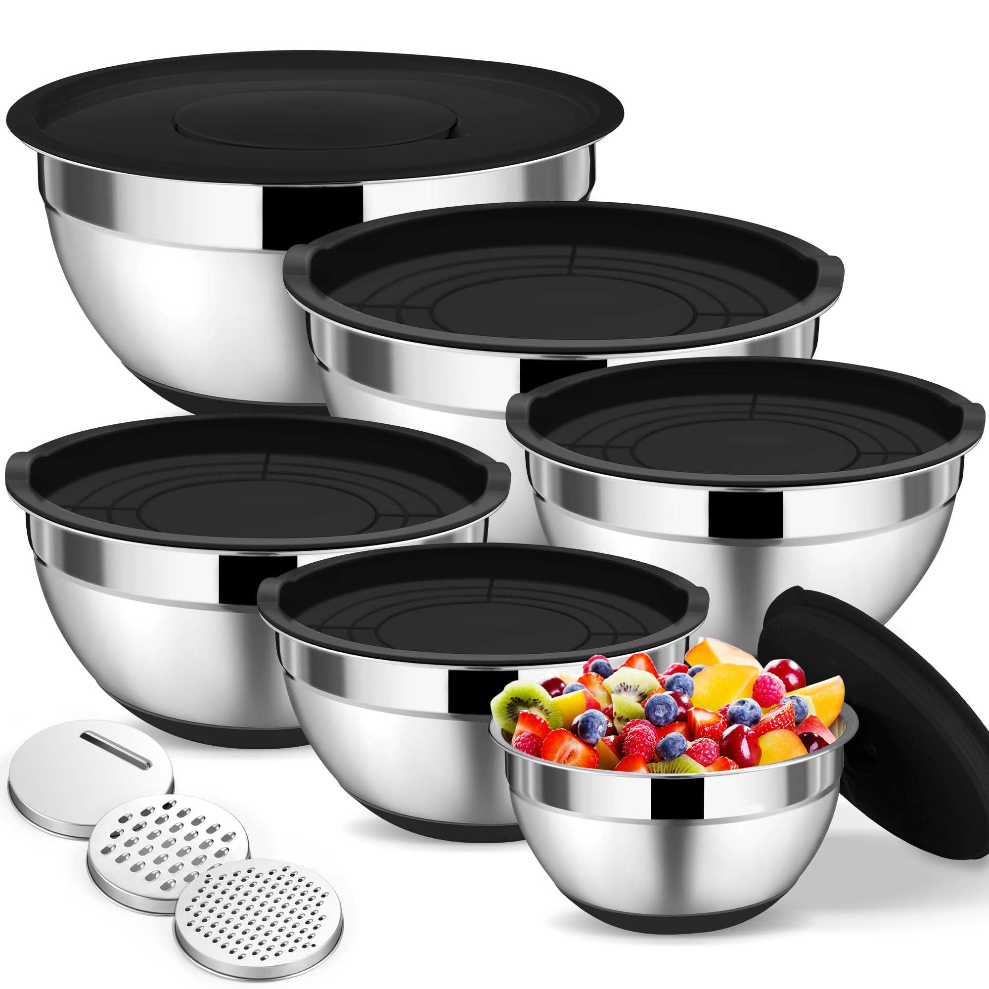 - HEALTHY & SOLID: Our mixing bowls set is made of premium stainless steel, food grade plastic lids and silicone base, Without toxic substances releasing to your food for healthy daily use, Thick gauge metal mixing bowls are much sturdier and not easy to crack and rust, Superior than glass or ceramic bowl, Ensuring the longevity of the bowls for long-term service, Decent weight facilitates comfortable grip and transfer