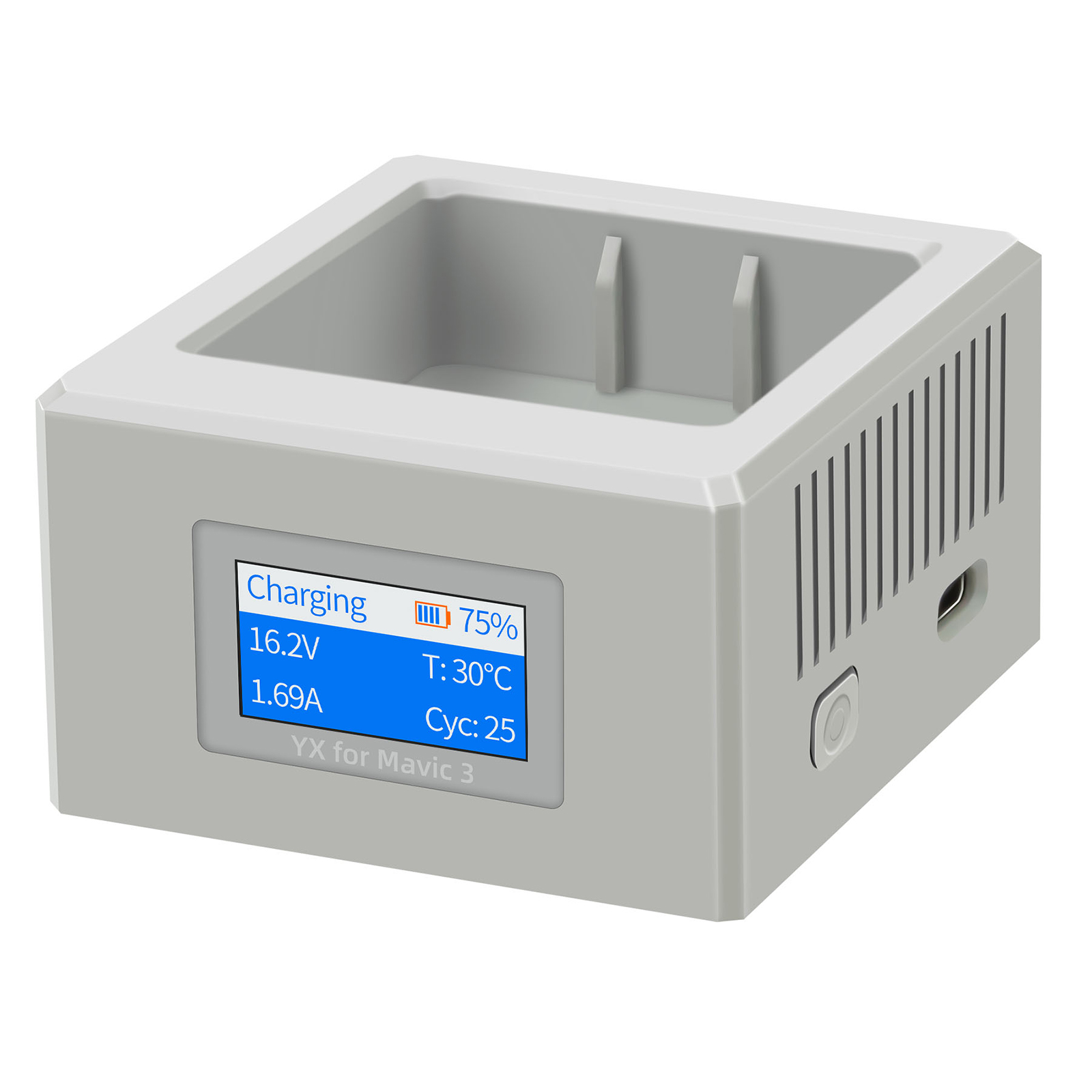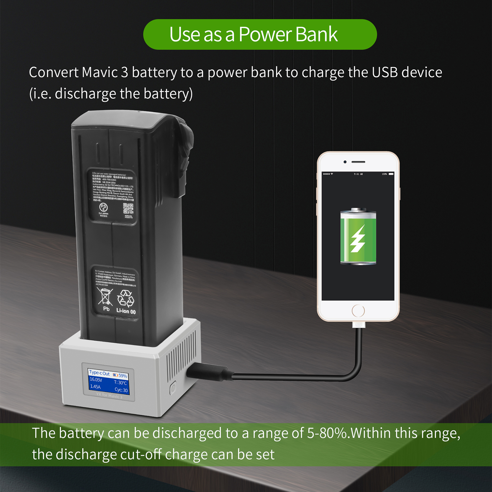 Features: l Two working modes: 1, Charging mode; 2, Storage charging mode l You can quickly check the battery level l Stable charging performance, long service life l Digital LCD screen l Converts the Imperial 3 battery into a rechargeable battery to charge other USB devices (i.e., discharges the battery). The discharge adjustment range of the battery is 5-80%. The default discharge cutoff power is 15%, and you can set the discharge cutoff power within the discharge range Specification: l Material: Plastic l Input: 5V/9V/12V/15V-3A;20V-5A l Output: 17.6V/5.5A (100W max) l TYPE-C Output: 5V/9V/12V-3A;15V/20V-3A l Size: 6.1x5.5x3.3CM l Applicable Model: for Mavic 3 Package: l 1x Charger