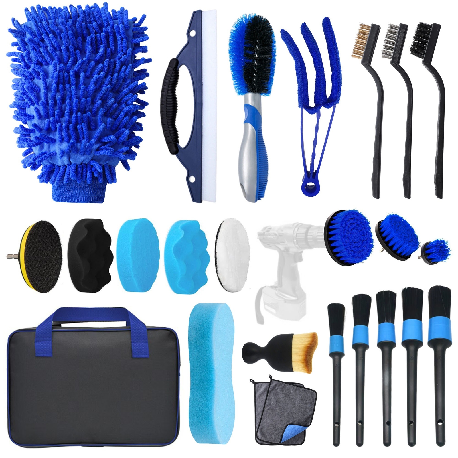 【Ideales Detailbürsten-Set】 24-teiliges Autowasch-Detailbürsten-Set, bestehend aus 1 Autowaschhandschuh, 1 blau-schwarzer Reifenbürste, 1 D-förmiger Autowischer, 5 Reinigungsbürsten für Klimaanlagen-Entlüftungsöffnungen, 3 kleinen schwarzen Herdbürsten, 1 komprimiertem Schwamm, 5 3-Zoll-Polierschwämmen für elektrische Bürsten, 1 Autobürste, 1 Autoreinigungsbürste, 3 elektrischen Bürstenköpfen (5,1 cm, 10,2 cm, 12,7 cm), 2 blauen Handtüchern und 1 blauen Tasche.