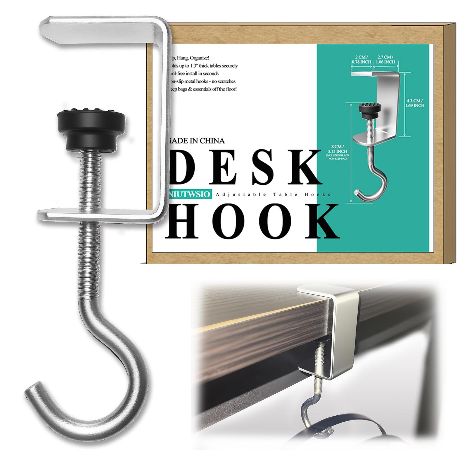 - Adjustable & Easy Installation: Adjustable desk hook clips feature a user-friendly screw design - simply clamp and twist to secure. The clamp with hook can be easily adjusted to fit most table thicknesses, making them versatile as desk hanger hook options. No tools or glue required, install these hanging clamp hooks under tables or shelves from the front or side, and remove them just as easily