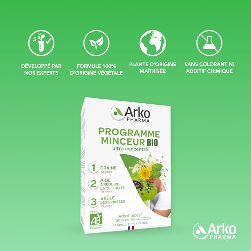 CURE D’UN MOIS : Ce coffret contient 3 x 10 ampoules, pour une cure drainante et minceur de 30 jours. La gamme Arkofluides est certifiée ECOCERT, et ce Programme Minceur est réservé à l’adulte.