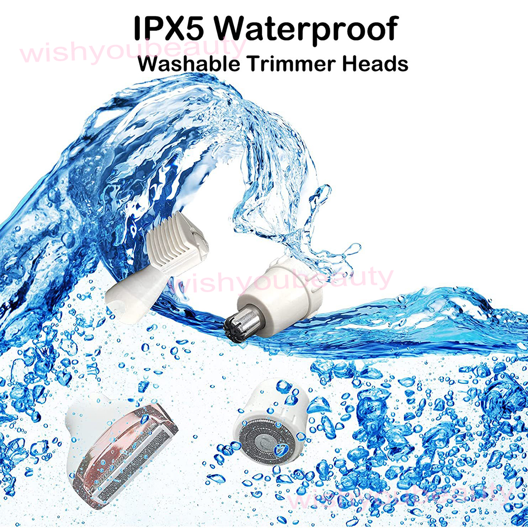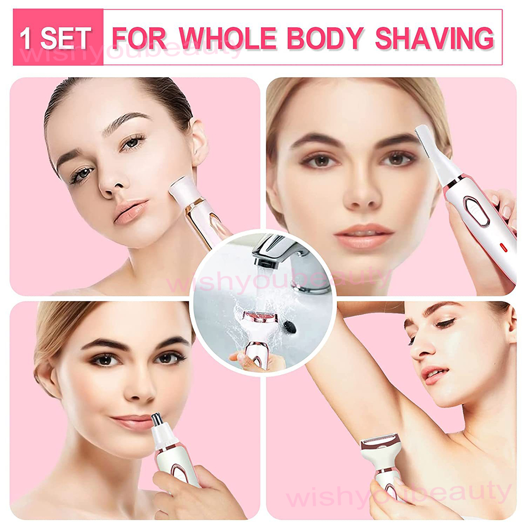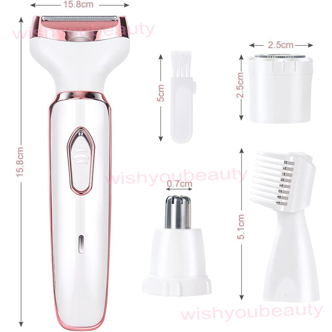 This electric shaver comes with four shaving heads, including a women's shaver, eyebrow trimmer, beard trimmer, body shaver, and nose/ear trimmer.