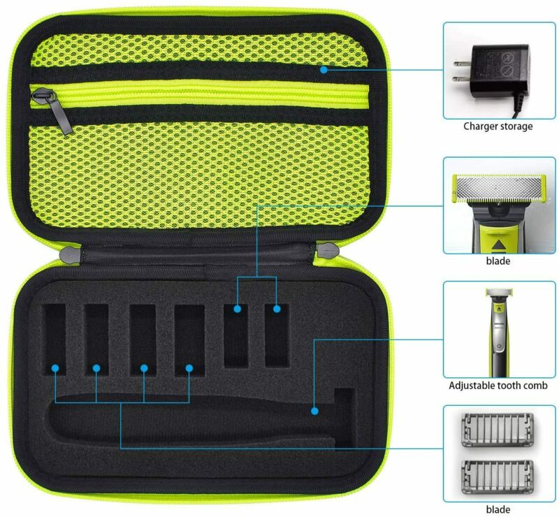 - Case suitable for Philips OneBlade Trimmer & Shaver QP2520, QP2530, QP2570, QP2590,QP150 - Hard EVA shell,Shockproof & Dustproof & Waterproof. - Built-in Detachable Sponge. - Sturdy Hand Strap makes carrying easy. - Color: black&green Package including: 1* Hard case(Storage Bag only, other accessories are NOT included)