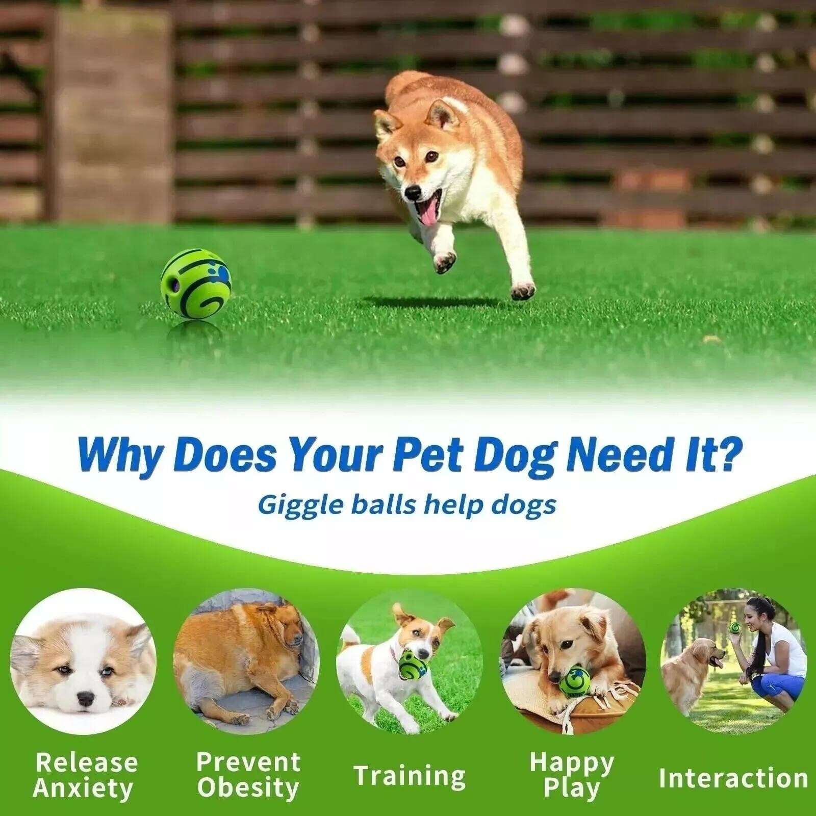 HAPPY, HEALTHY & FIT! By engaging our dog's natural curiosity and instinct to play with giggling sounds when rolled or shaken, this toy keeps your pup active and entertained throughout the day providing great exercise for your best friend!