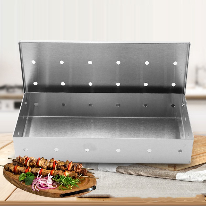 1. Place DRY wood chips in your smoker box. The reason people soak their wood chips first is to prevent them from catching fire. Your smoker box does not have holes on the bottom so the wood chips should not catch on fire. Yes, you can use soaked wood chips with your smoker box if you want, but it will take longer for them to start producing smoke. We recommend dry wood chips for best results