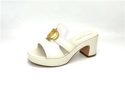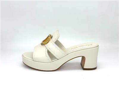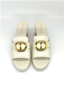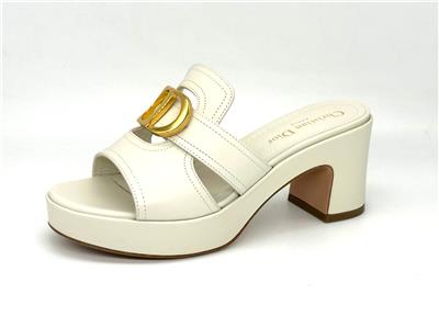 The gold-finish metal CD signature highlights the silhouette and adorns the cream calfskin.