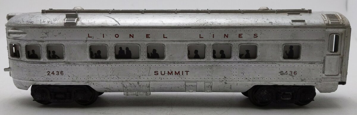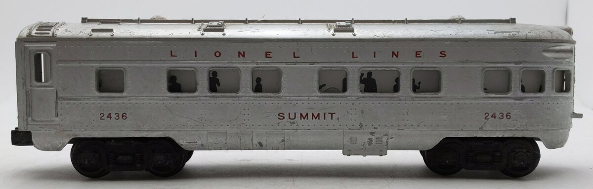 Here is a Lionel 2436 Vintage O Lionel Lines Illuminated Summit Observation Car. This model was pulled by many of Lionel's O and O27 Locomotives in the 1950's. Standard features on the 2436 include: painted silver bodies with red lettering, silhouetted window strips, die-cast passenger car trucks with operating couplers plus interior illumination. It measures 11 inches long.