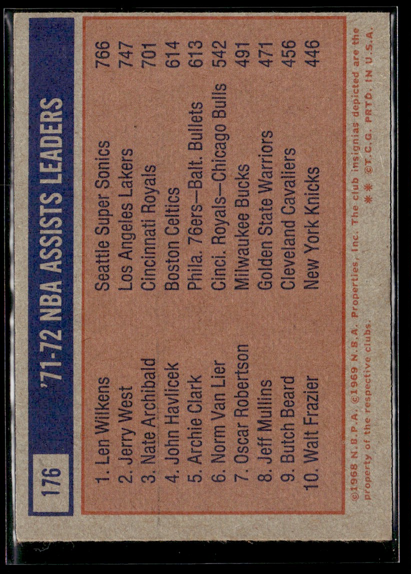 | Description: | NBA Assists Leaders (Lenny Wilkens, Jerry West, Nate Archibald) LL | | Category: | Basketball | | Year: | 1972 | | Product: | Topps | | Team: | EX/MT Set Break | | Card Number: | 176 | | Dimensions: | 3¾" x 2½" | | SKU: | BK B0003 R01 H (55) |