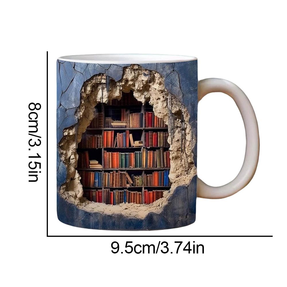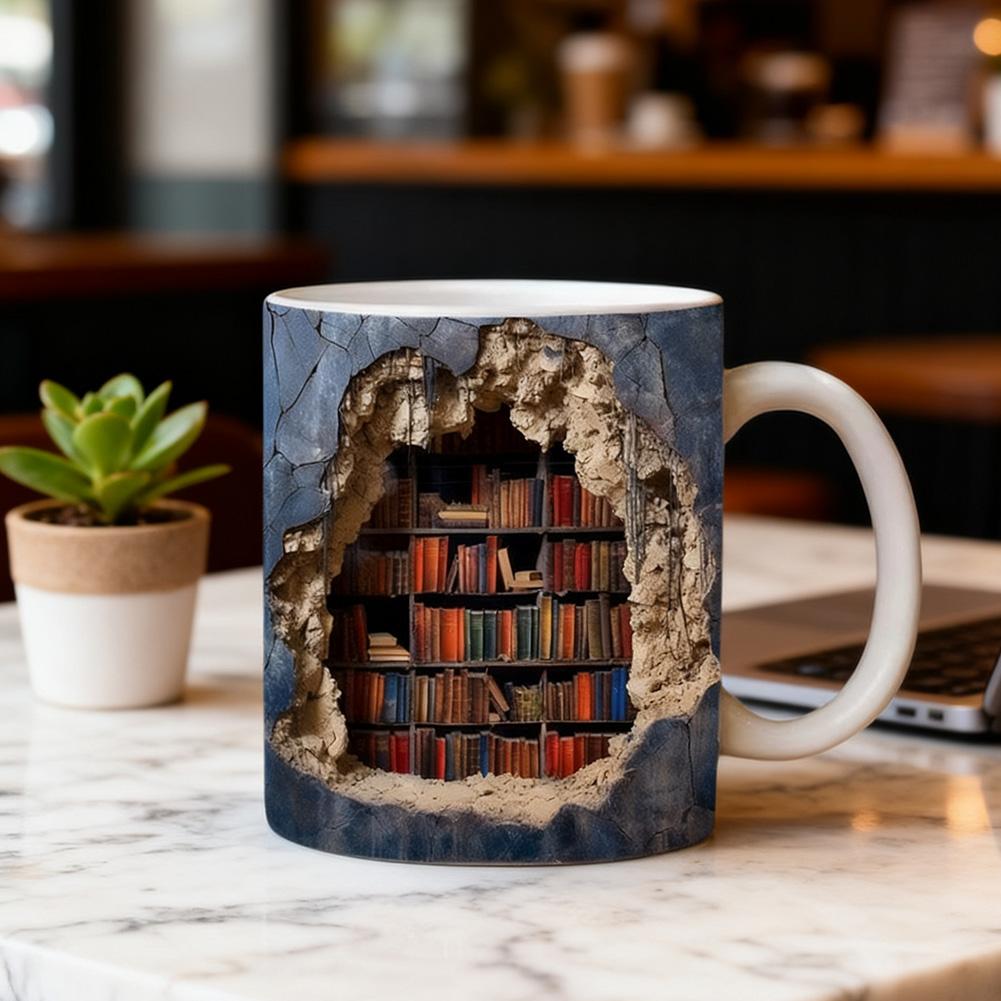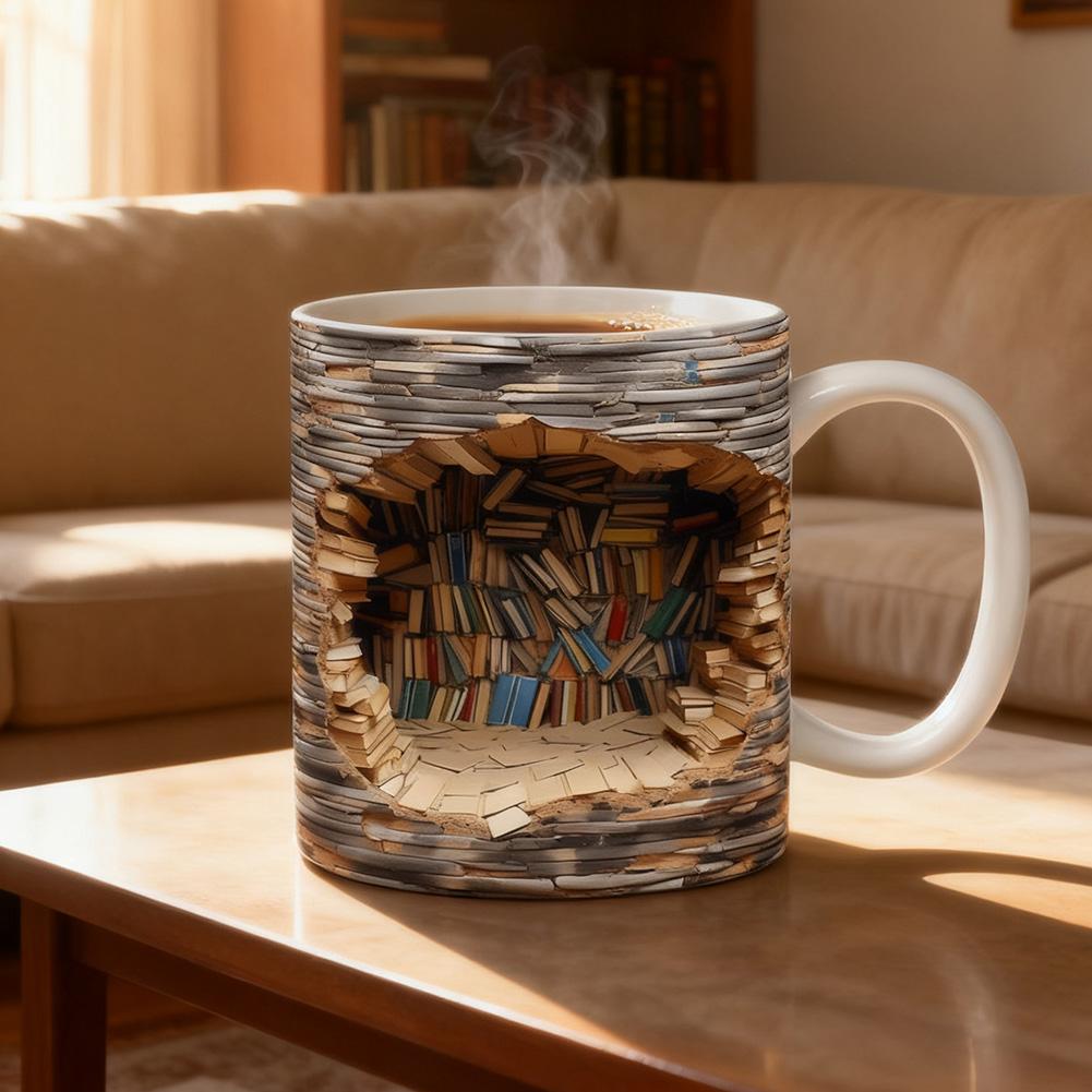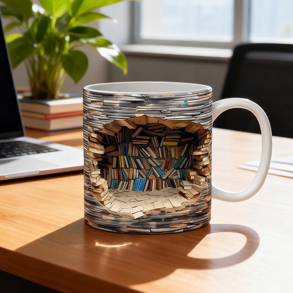 【3D Bookshelf Mug】This 11oz ceramic mug features a unique 3D bookshelf design that brings a literary flair to your morning routine. Ideal for book enthusiasts, writers, or anyone who appreciates clever home accents, the mug showcases a realistic stack of classic books wrapped around the cup, creating an artistic illusion that stands out in any setting.