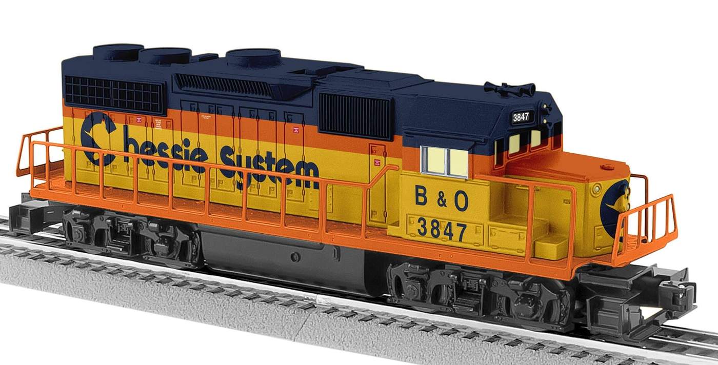 This is a Lionel 2034200 O Scale Chessie System LionChief GP38 Diesel Locomotive #3847. It features: LionChief® Command equipped - Lash-up with similar LC+ 2.0 locomotives in Command Control LC+ 2.0 Control - operate with Bluetooth™ using Universal Remote or LionChief® App on your smart device OR via your TMCC/LEGACY®Cab OR conventional transformer, Die-cast boiler, ElectroCouplers™, Crew figures, RailSounds® equipped - Diesel engine and background sounds and Towercom dialog! 4 Chuffs/Revs, Volume control via TMCC, Universal Remote or App, Crew Talk, Volume Control, Background Sounds, Whistle/Horn, Bell, Headlight / Rear light Numberboards, Directional Lighting, Cab Light, Firebox Flicker, Marker Lights, Ditch Lights, Strobe Lights, MARS Lights, Fan-driven main smoke, Speed Control.