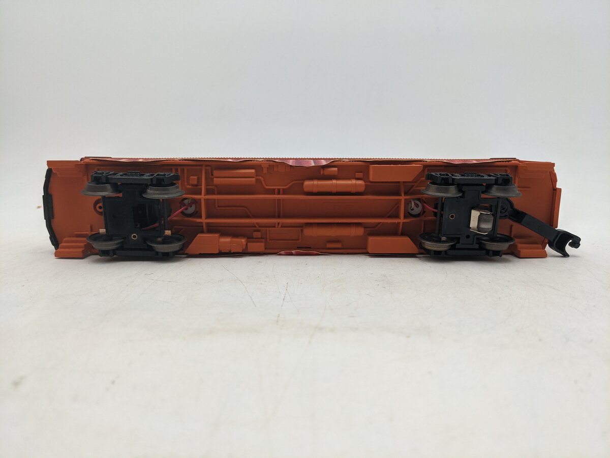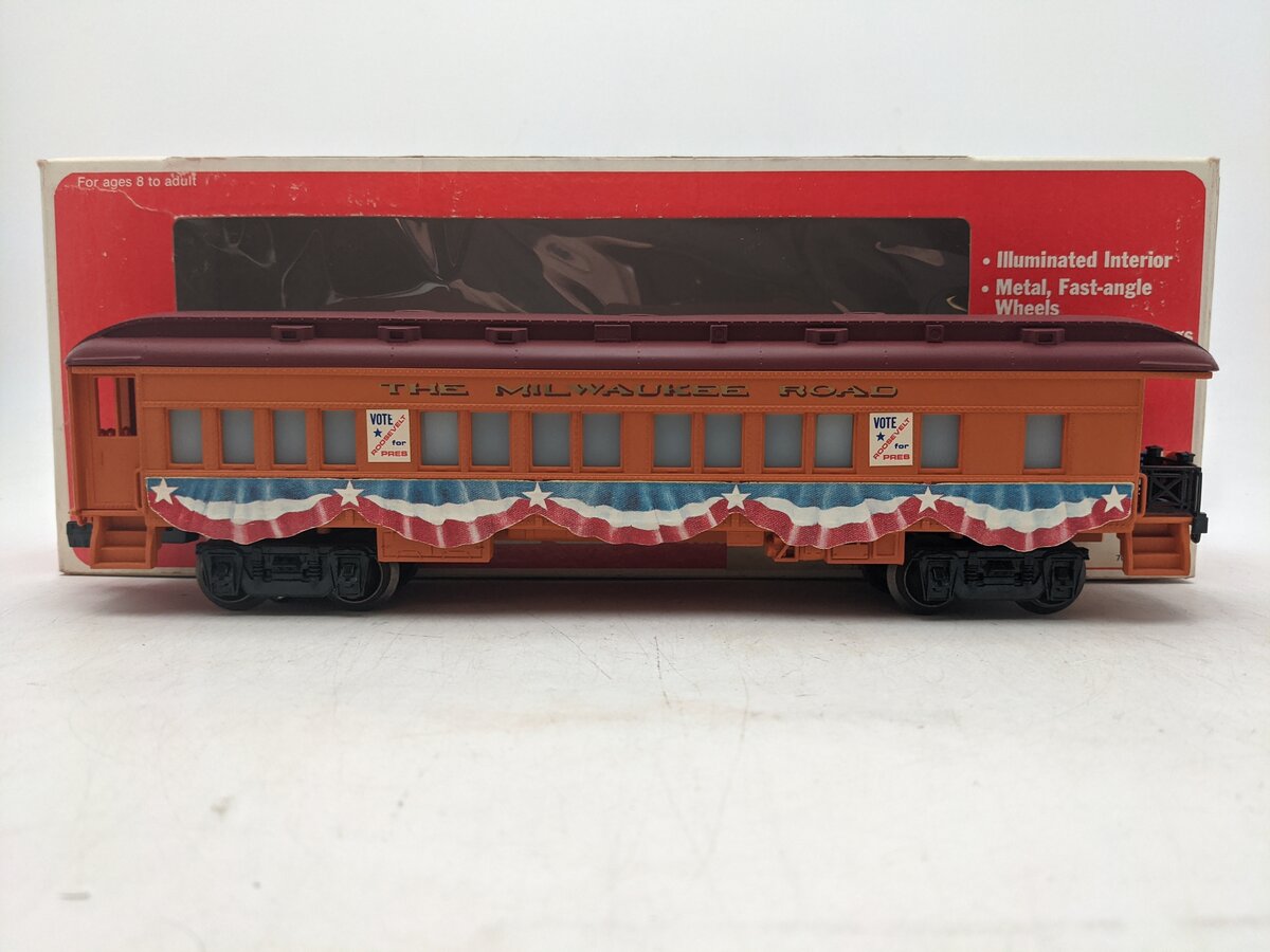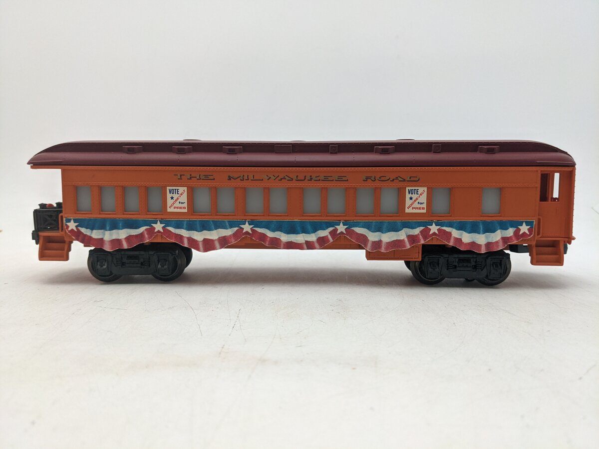 This is a Lionel 6-9527 O Gauge Milwaukee Road FDR Campaign Observation Car from 1976. This special uncatalogued car is an add on to the Milwaukee Road Passenger set. It features a plastic body, an illuminated interior, plastic trucks with operating couplers, metal wheels and axles, and it measures 12-1/2 inches long. The trim flag is included.