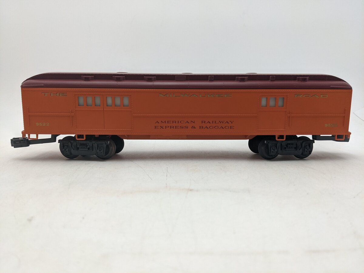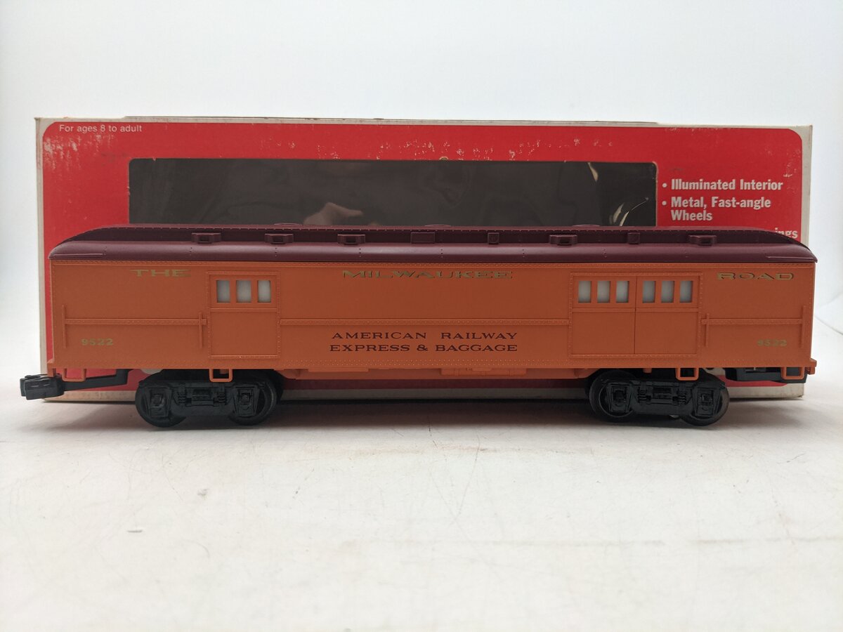 This is a Lionel 6-9522 O Gauge Milwaukee Road Baggage Car #9522 from 1975-76. It features a durable ABS body, an illuminated interior, plastic couplers, plastic trucks and it measures 12 inches long.