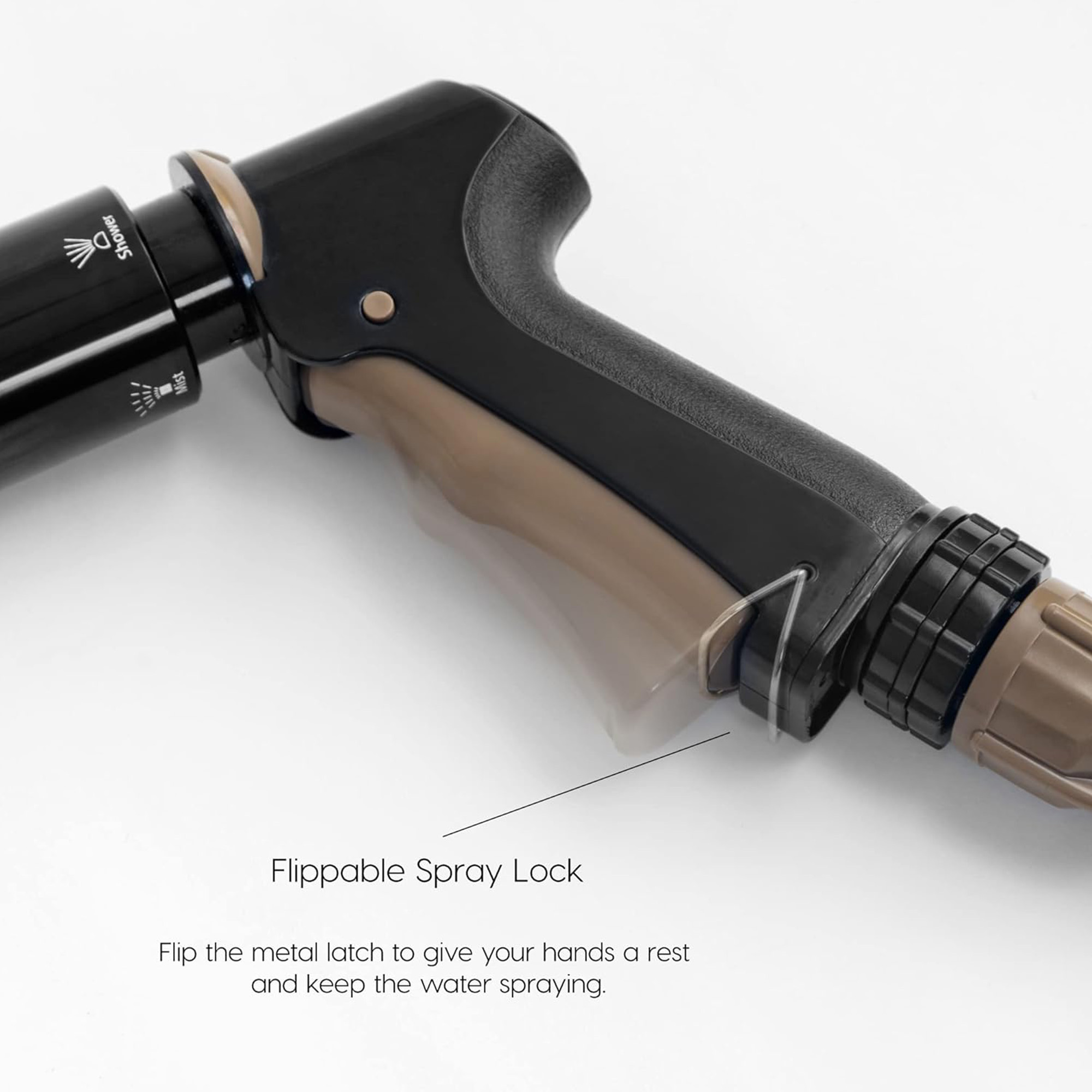 Designed for smooth operation, the easy-winding handle allows for effortless hose retraction, keeping the hose neatly stored inside the protective box to prevent tangles, kinks, and unnecessary wear. The nozzle features two selectable water strengths and 5 spray patterns, shower, rinse, jet, flat, and mist, so you can easily switch from gentle plant watering to powerful surface cleaning. A metal latch locks in your selected spray setting to help reduce hand fatigue during extended use.