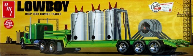 This is an AMT 7591 1:25 Scale Lowboy Drop Deck Trailer Plastic Model Kit.
