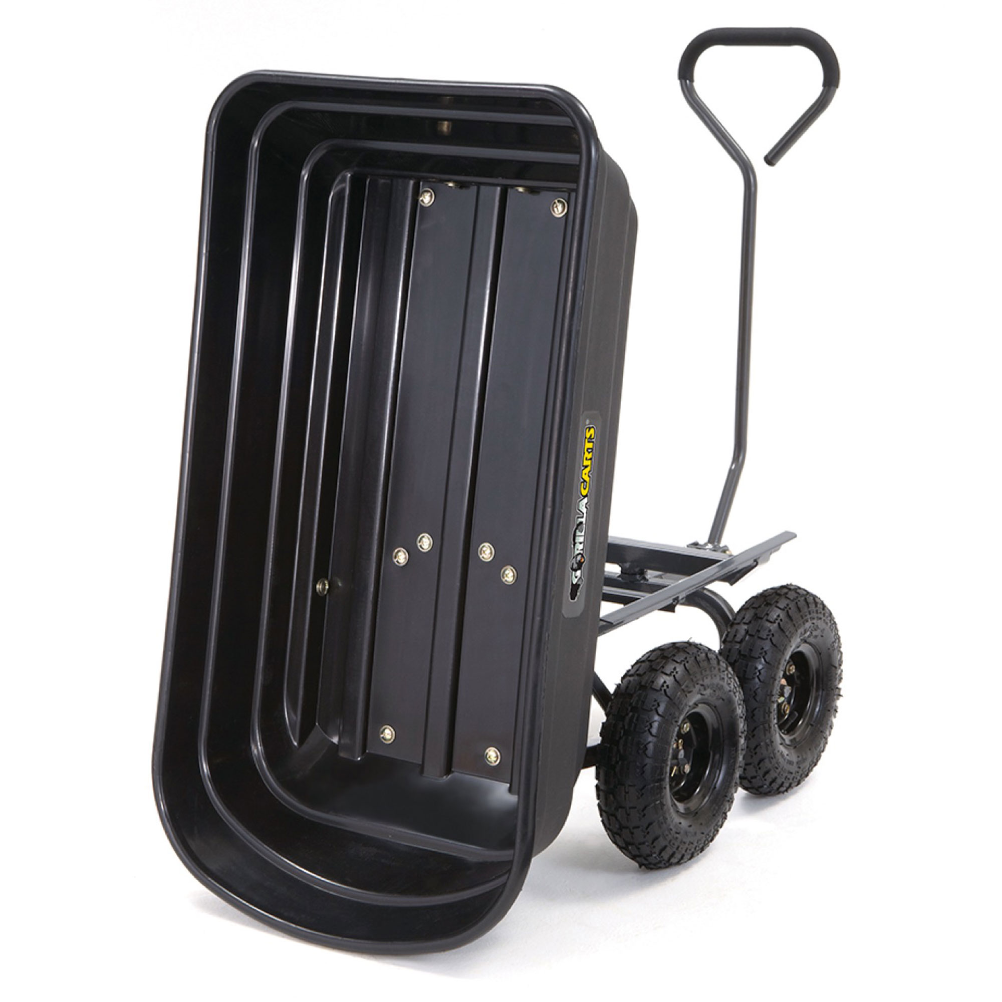 Transport rocks, mulch, and dirt for rugged use, or use as an outdoor camping cart, dog wagon, or grocery wagon! Make hauling heavy loads simple, effortless, and convenient with the Gorilla Carts Poly Garden Dump Cart.