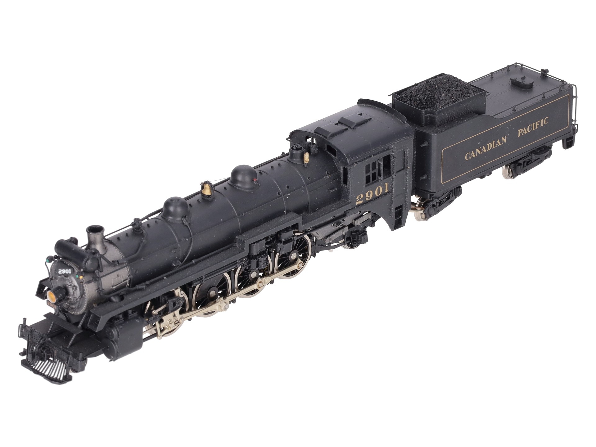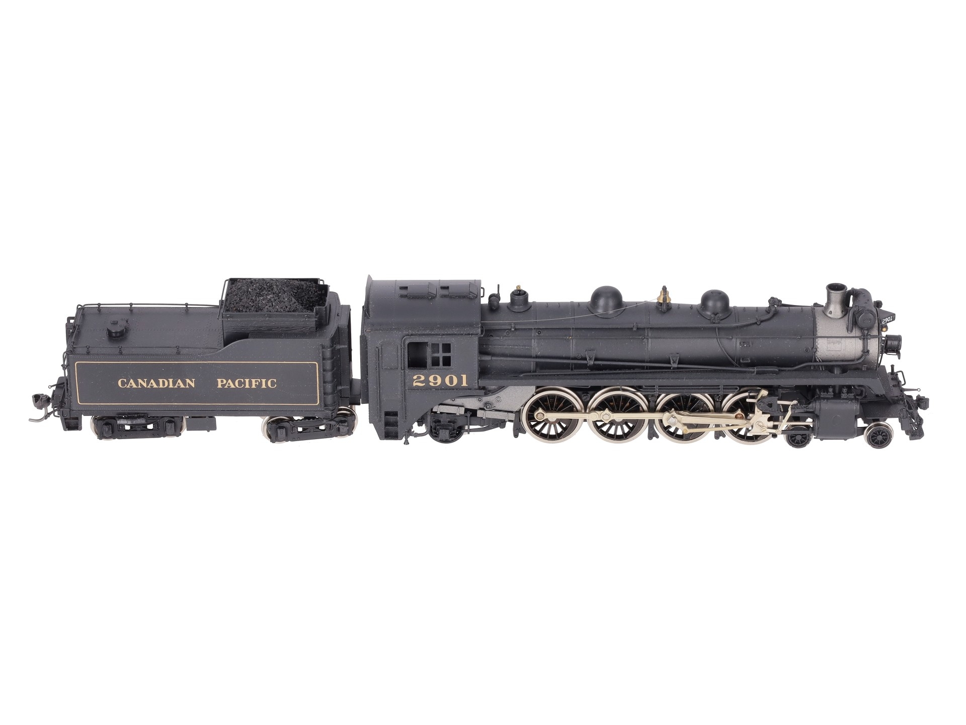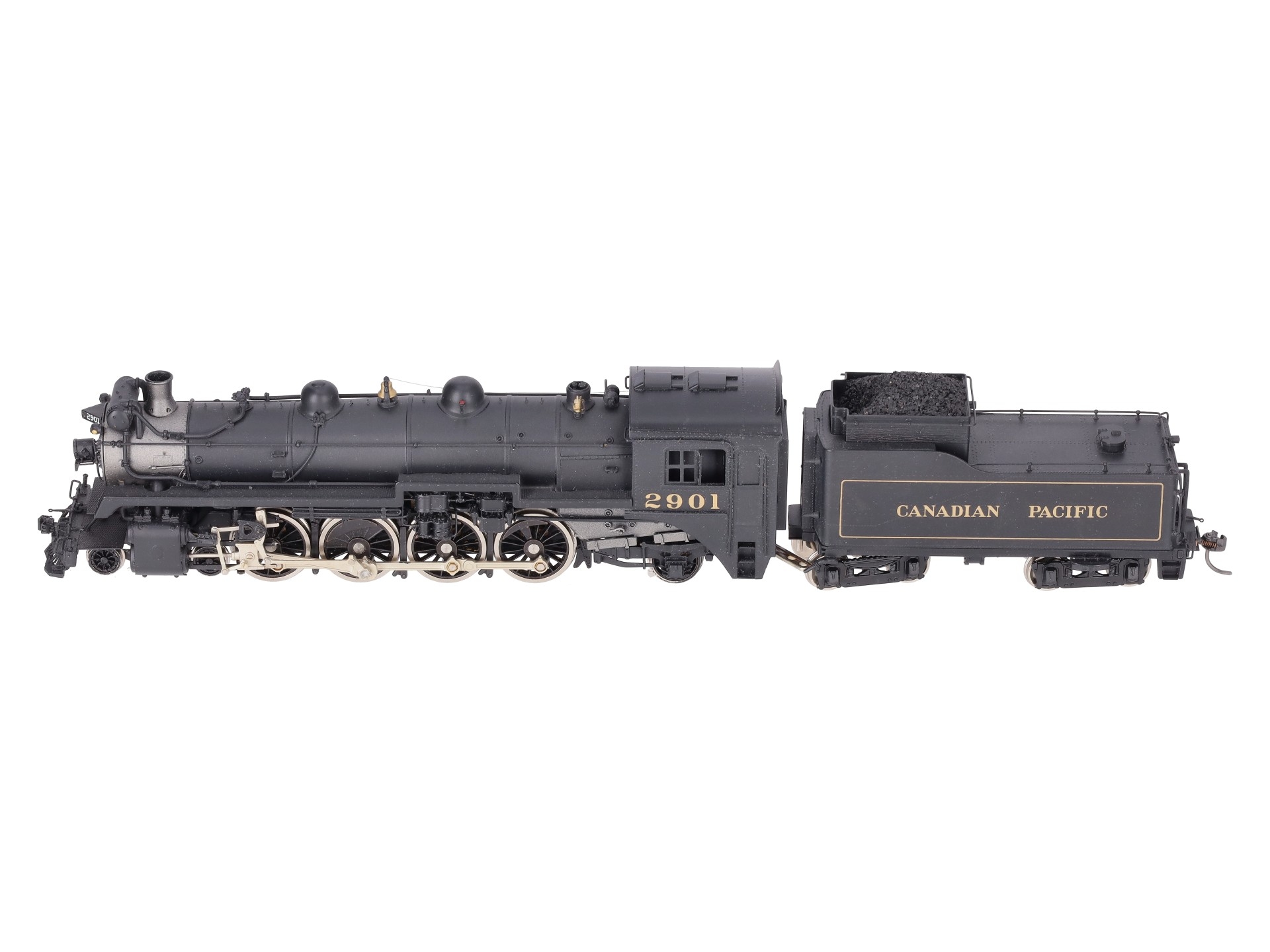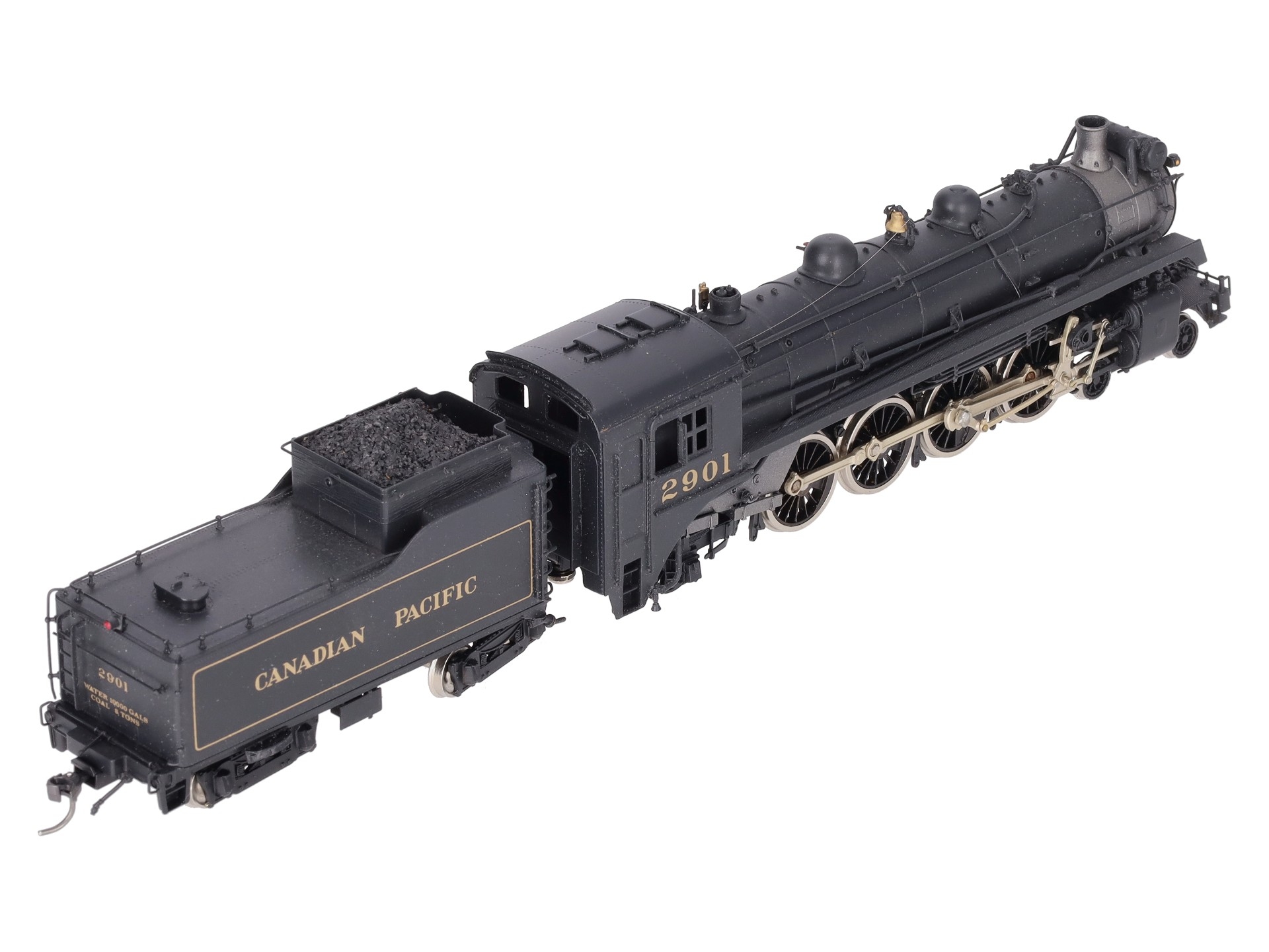 Here is a Samhongsa HO Scale Canadian Pacific 4-8-2 I-1A Steam Locomotive & Tender #2901. The locomotive and tender feature painted brass construction, brass trim, brass trucks, knuckle couplers, and metal wheels. The locomotive is powered.