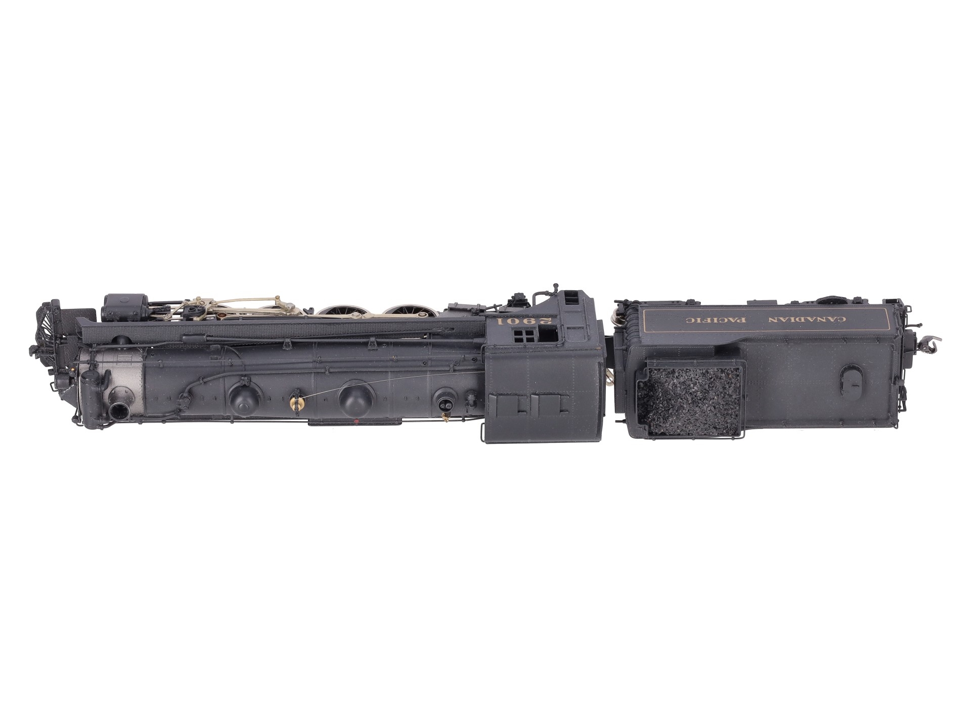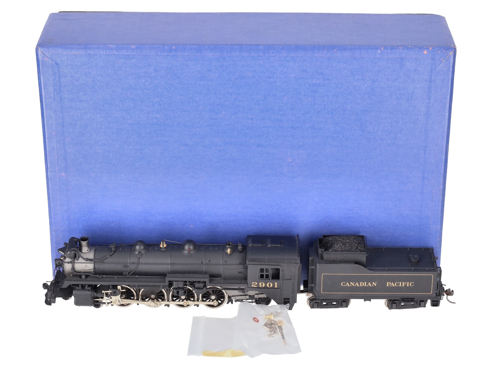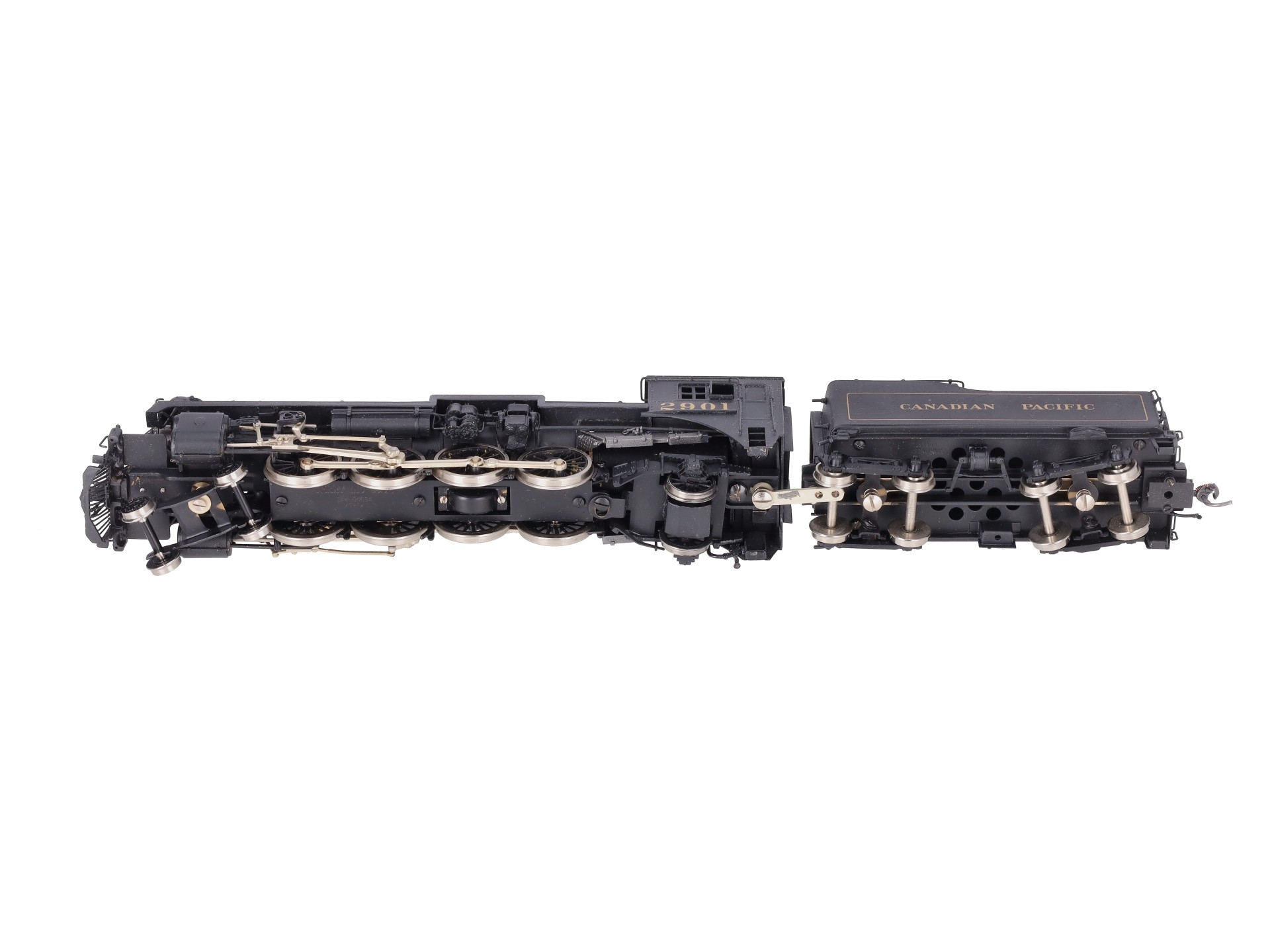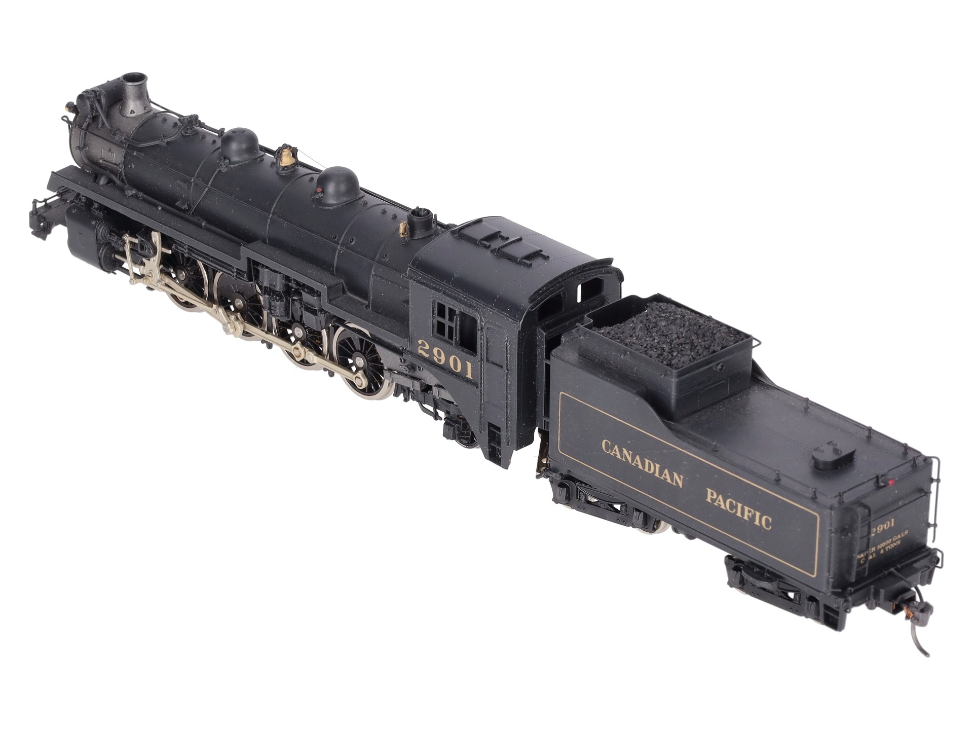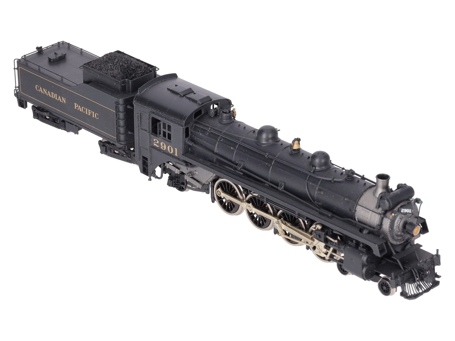 Here is a Samhongsa HO Scale Canadian Pacific 4-8-2 I-1A Steam Locomotive & Tender #2901. The locomotive and tender feature painted brass construction, brass trim, brass trucks, knuckle couplers, and metal wheels. The locomotive is powered.
