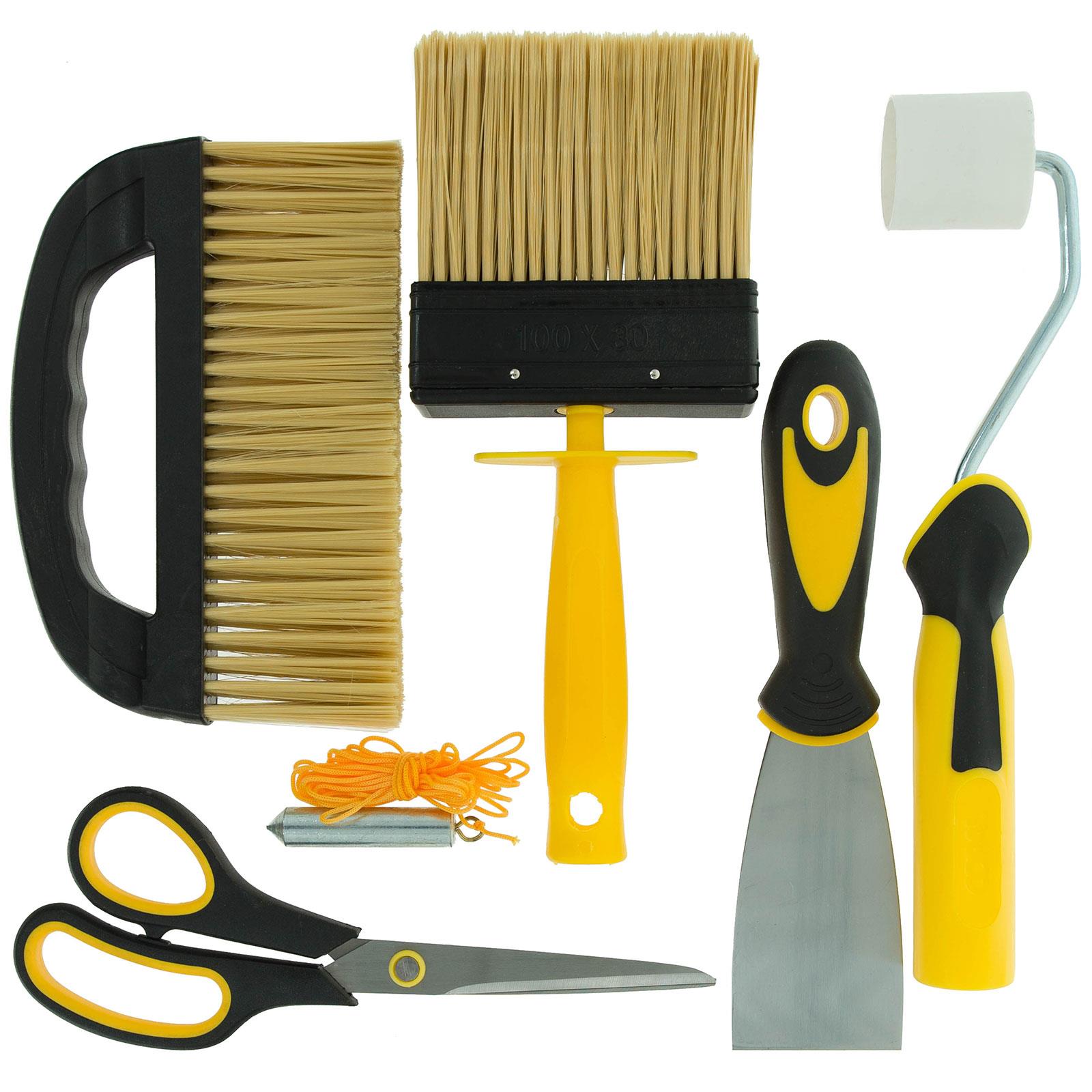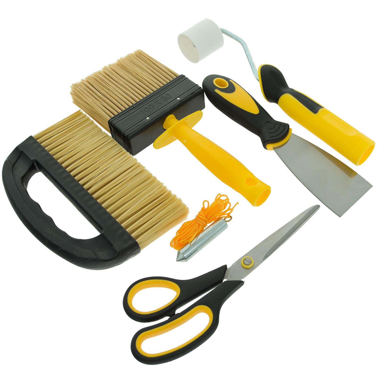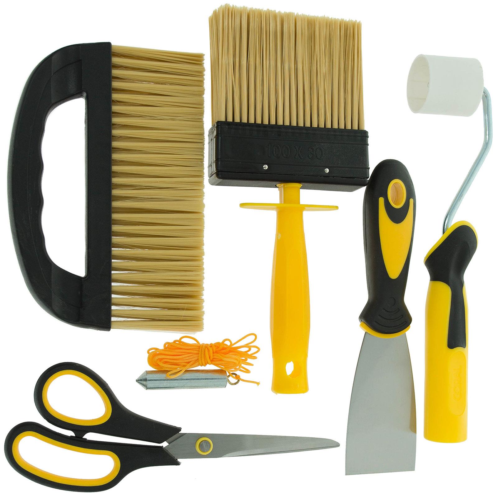 Is your old wallpaper tool set letting you down? The Paperhanging Set 6PC by Coral Tools is the perfect fit for hanging wallpapers and wallcoverings. While paperhanging, you'll be assured of a good finish with most flat wallcoverings! Featuring a convenient collection of products for everything you need. You'll receive a set including 4" block brush, wallpaper smoothing brush, seam roller, plumb bob & line and stripping knife. These high quality tools are comprised of plastic handles, synthetic brush filaments, steel blades and a metal plumb bob with string line. With this complete wallpaper tool set you'll experience a smooth paperhanging process.