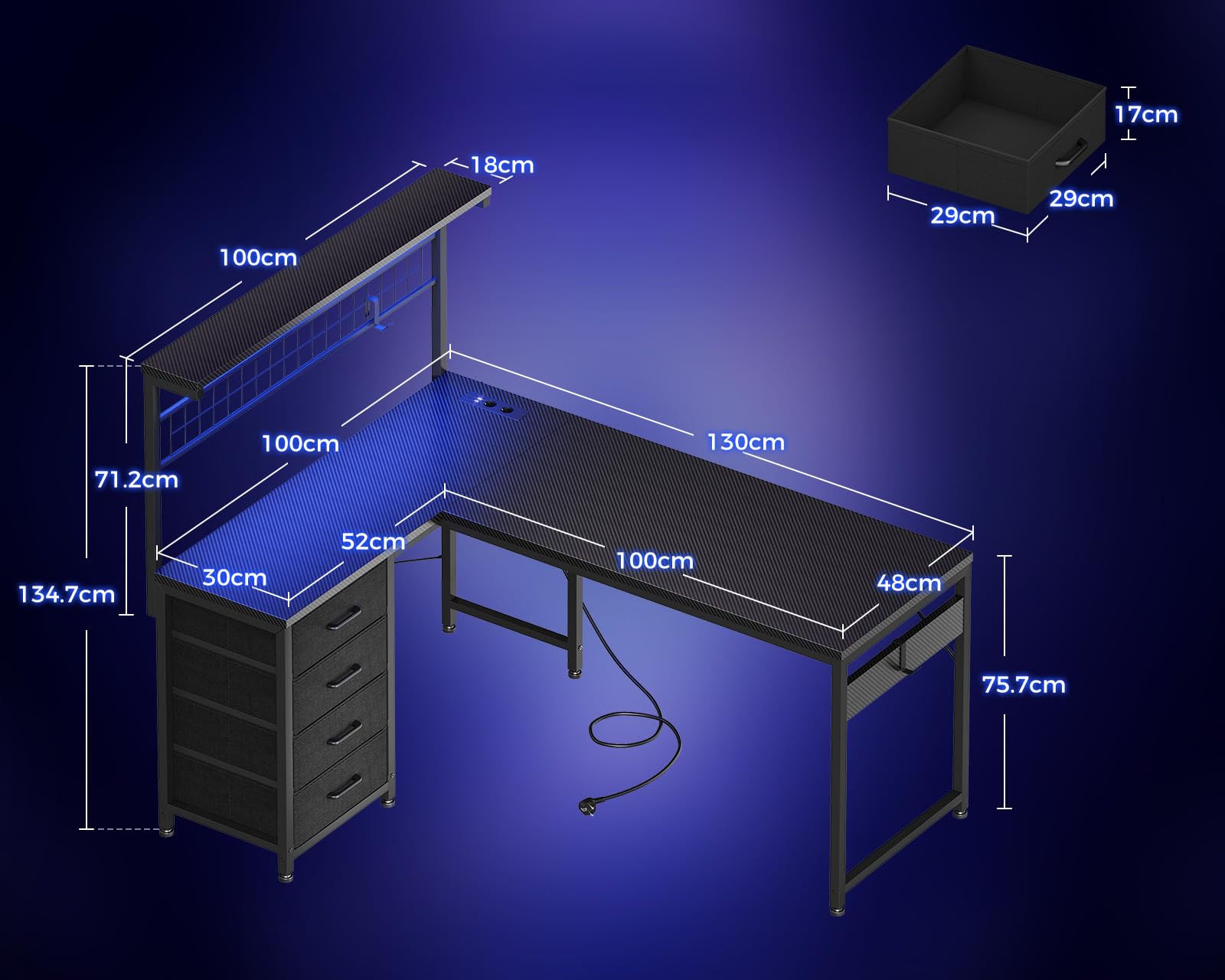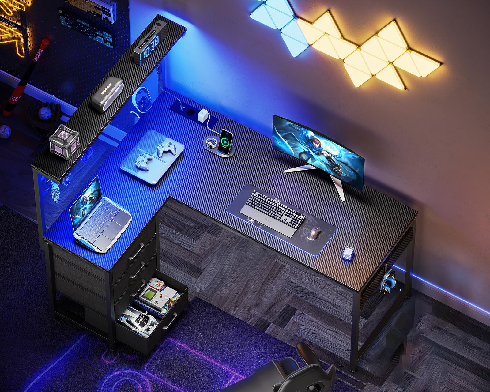 【Design a L regolabile – Area di lavoro multifunzionale】 Questa scrivania gaming presenta un design a L flessibile e reversibile, consentendo l'installazione a sinistra o a destra in base alle esigenze di spazio. Dotata di una mensola superiore intercambiabile, cassetti, prese di corrente, striscia LED e gancio per cuffie, offre una superficie modulare e efficiente, migliorando significativamente l'utilizzo dello spazio.