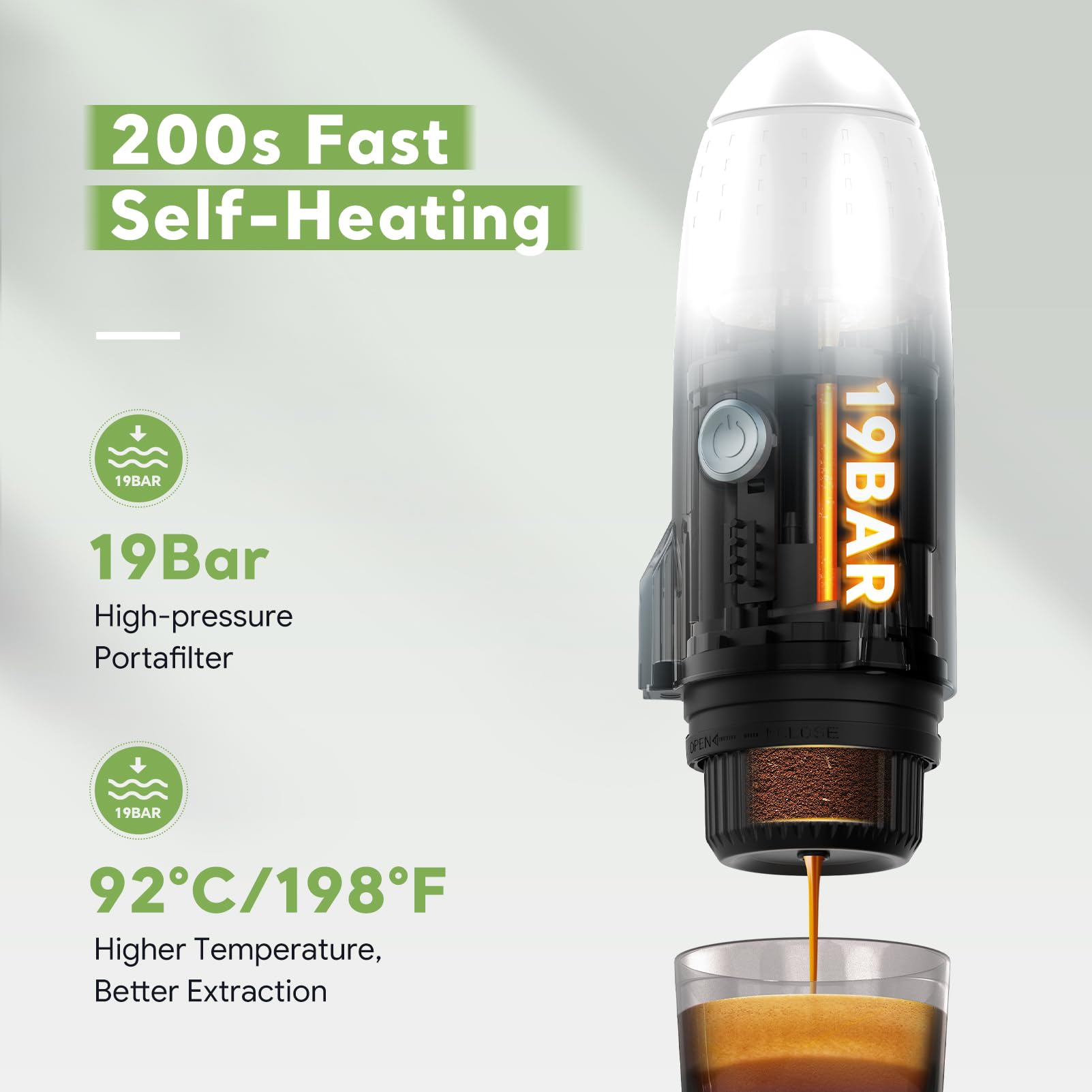 Funzionamento con un pulsante: macchina da caffè espresso portatile: riscalda l'acqua ed estrae automaticamente l'espresso con una sola pressione. Tazza da caffè ottimizzata da 3,2 '' più alta di altre per liberare effettivamente le mani dal tenere la macchina durante l'estrazione.
