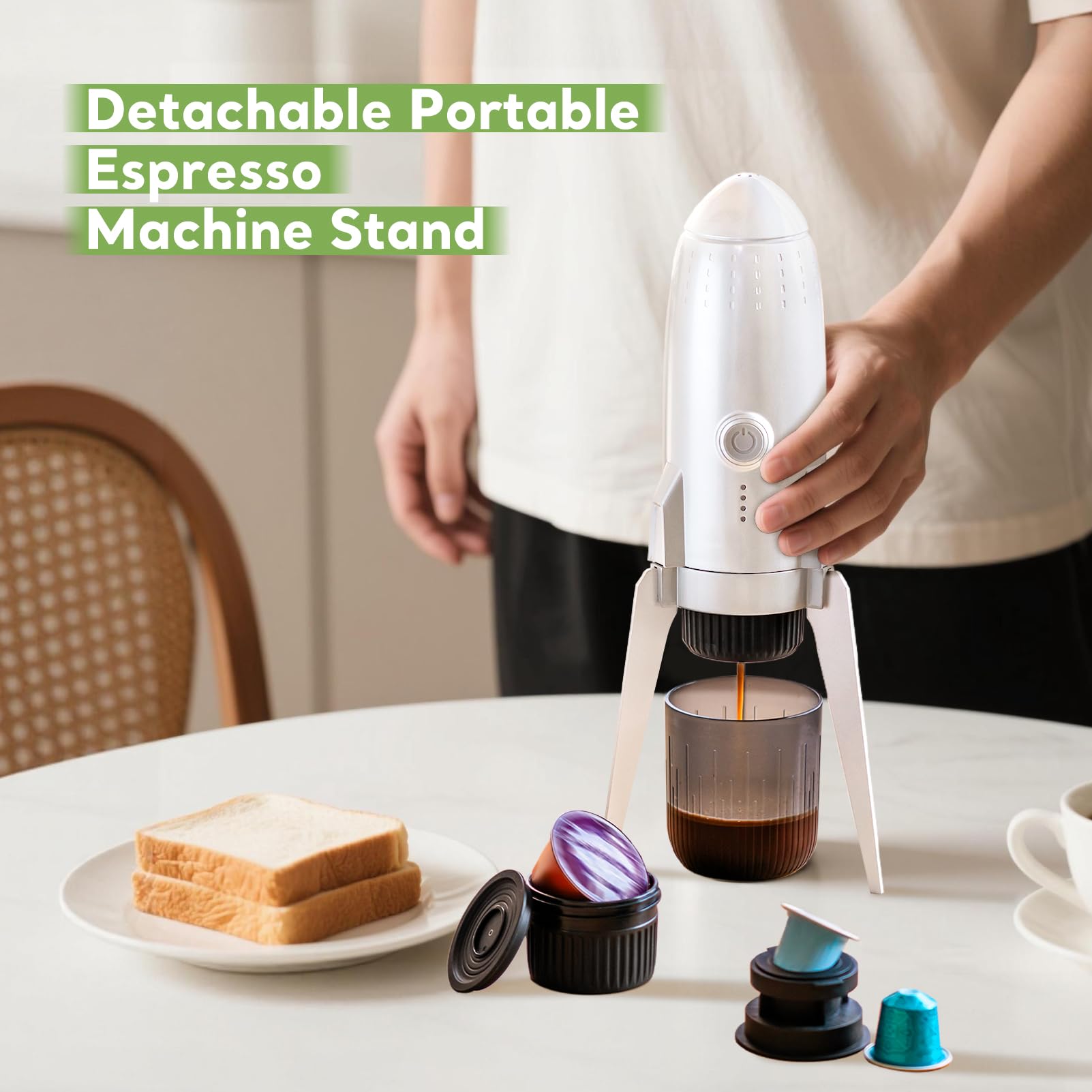 Basta usare un pulsante, è possibile iniziare a preparare l'espresso senza il fastidio di una configurazione complessa, è possibile scegliere l'uso di acqua calda o fredda, utilizzare caffè in alluminio originale/cialde DolceGusto o caffè macinato per preparare l'espresso aromatico. Questa macchina per caffè espresso elettrica portatile è ragionevolmente strutturata con un diametro maggiore, non rompe la crema di caffè ed è comoda per la pulizia.