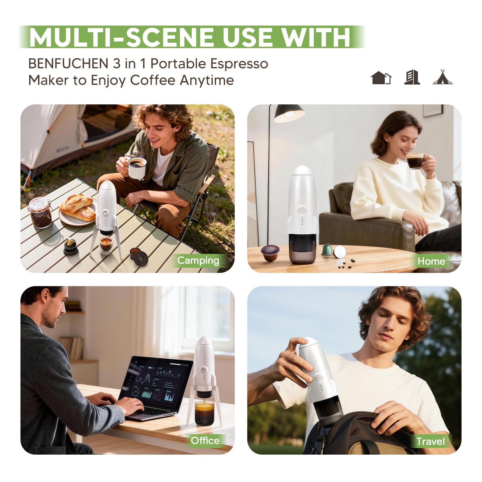 Utilizzare con capsule OrginalNespresso/DolceGusto o caffè macinato, la macchina da caffè portatile BENFUCHEN ti aiuta a preparare deliziosi espresso, cappuccino, latte.