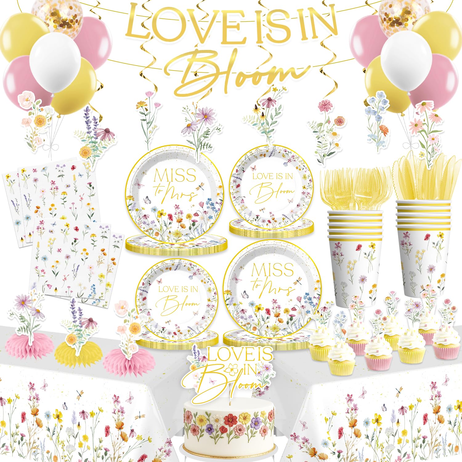 - 【Unique Design:】This set features hand-painted wildflowers in soft pink, yellow, blue, and purple hues, paired with a gold-stamped letter pre-threaded love is in bloom banner, easily creating a romantic and unified space. the entire wild flower bridal shower decorations are quick to set up, easy to clean, low-cost, and aesthetically pleasing, making it incredibly convenient
