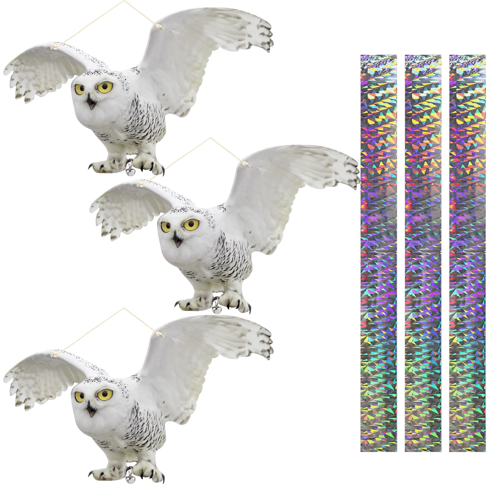 - Package Includes: Pigeon scared devices set include 3pcs hanging flat printed picture fake owls, 3pcs reflective tapes, 3pcs rope, and 3pcs bell.
