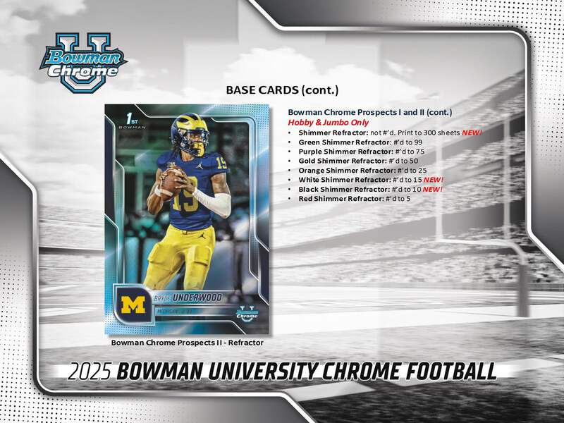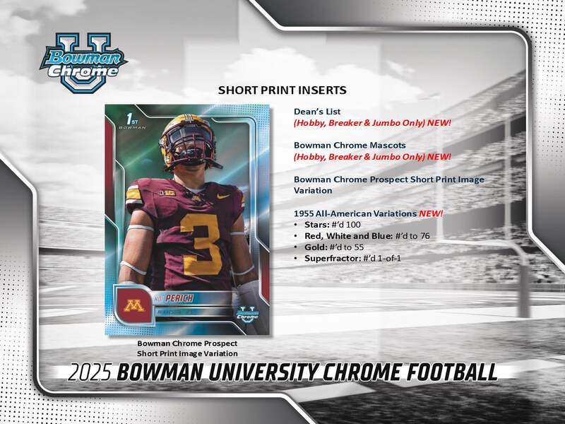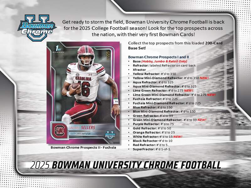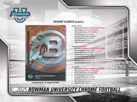 2025 Bowman University Chrome® Football storms back onto the field with a stacked checklist, fresh inserts, and the first Chrome® cards of tomorrow’s gridiron greats.
