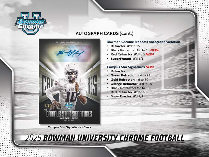 New inserts like College Rule Playbook, Path to Glory, Lettered Up!, and Acropolis bring bold design and storytelling to the field. And for those hunting ink, you’ll find autographs across the board—including Campus Star Signatures, 1955 All-American Variations, and Bowman Chrome® Prospect Autos.
