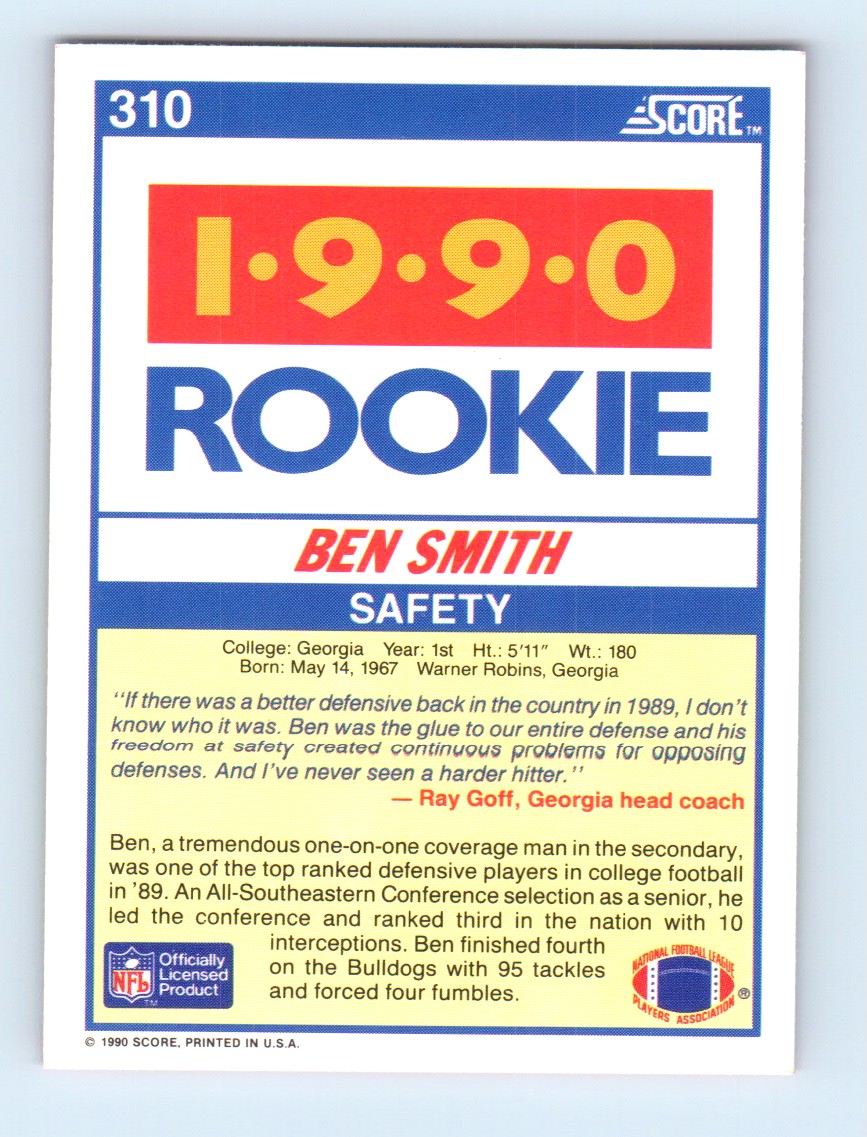 | 1990 Score Ben Smith Rookie Georgia Bulldogs #310 |