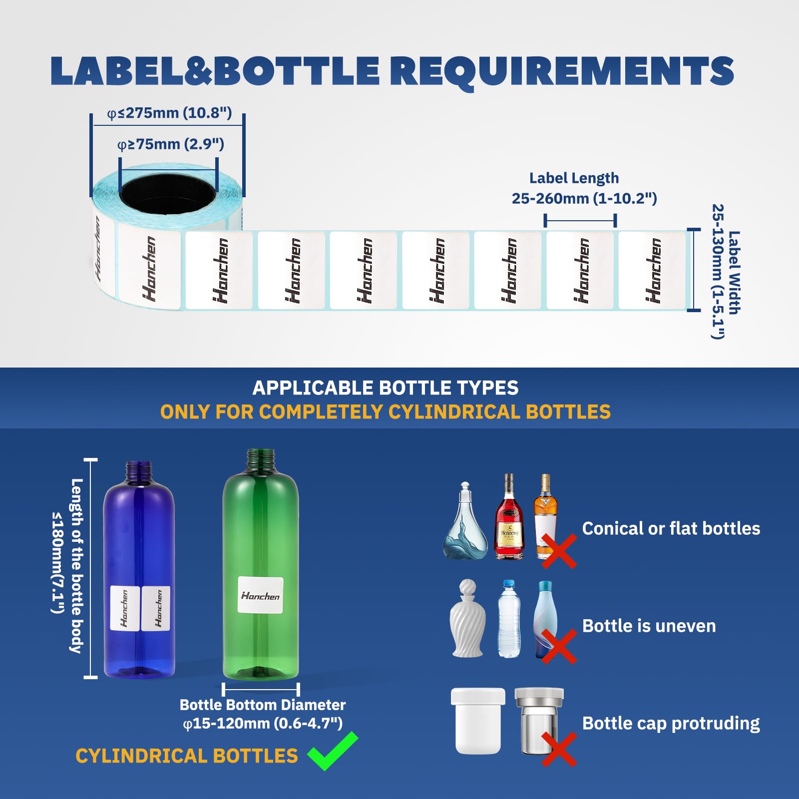 2. Ampia gamma di applicazioni: Può soddisfare l'etichettatura cilindrica di diametro 15-120mm. La precisione di etichettatura è alta: la deviazione tra la testa e l'estremità dell'etichetta è ≤±0.5mm.