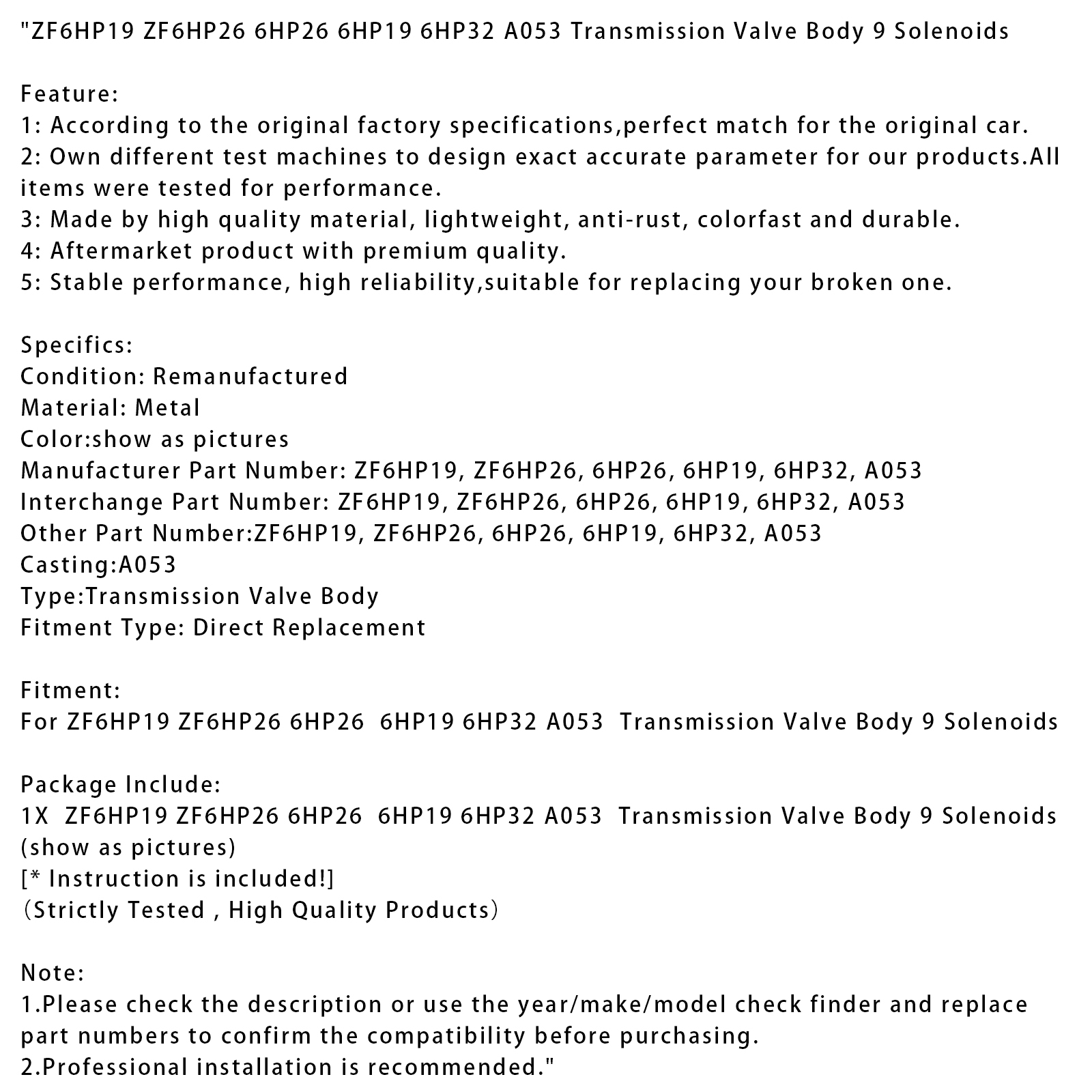 ZF6HP19 ZF6HP26 6HP26 6HP19 6HP32 A053 Transmission Valve Body 9 Solenoids