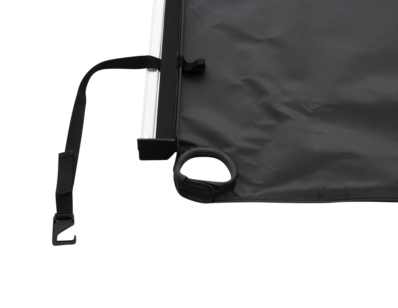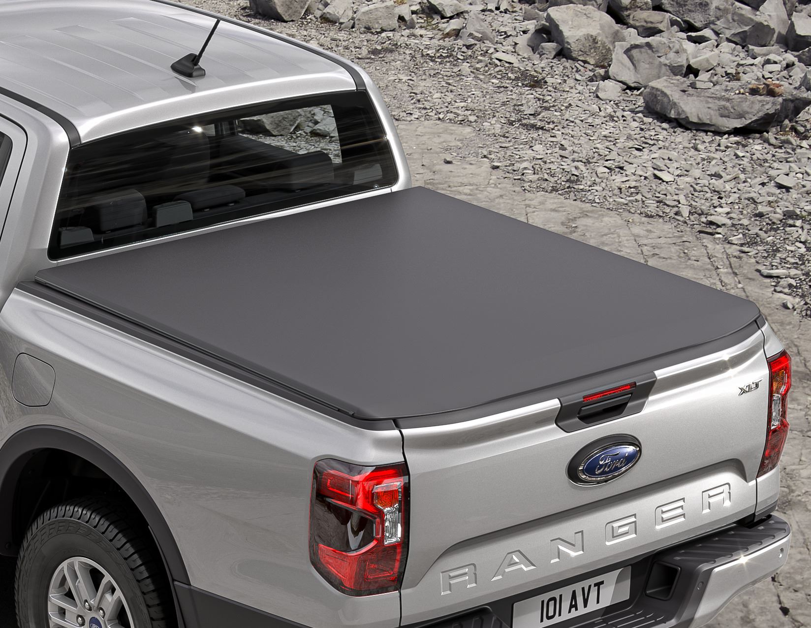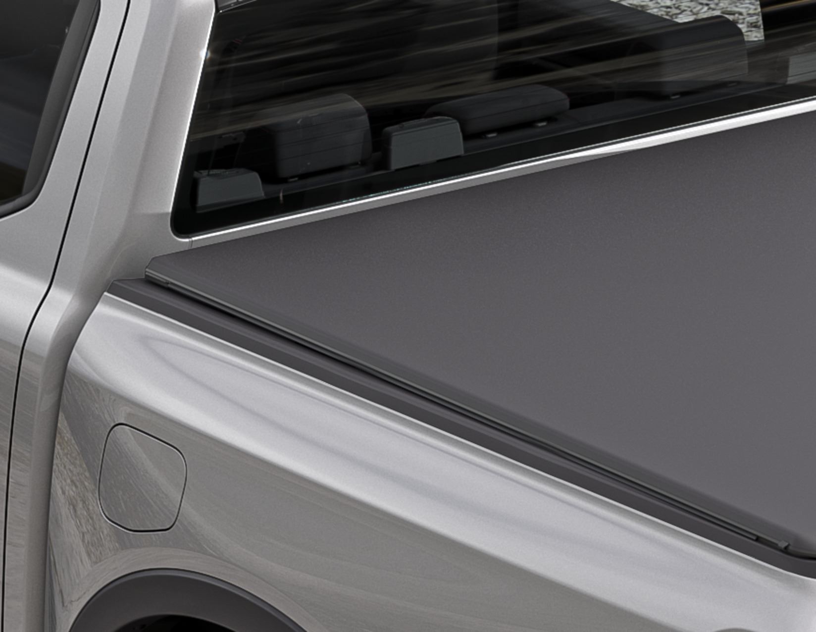 Das weiche Rollcover wird vorne mit einem Gurtsystem gesichert und mit einem Klicksystem am Heckprofil verriegelt, um die Ladefläche komplett abzudecken. Der Entriegelungsgriff an der Unterseite wird beim Schließen und Verriegeln der Heckklappe verdeckt, sodass Ihre Ladung sicher und geschützt bleibt.