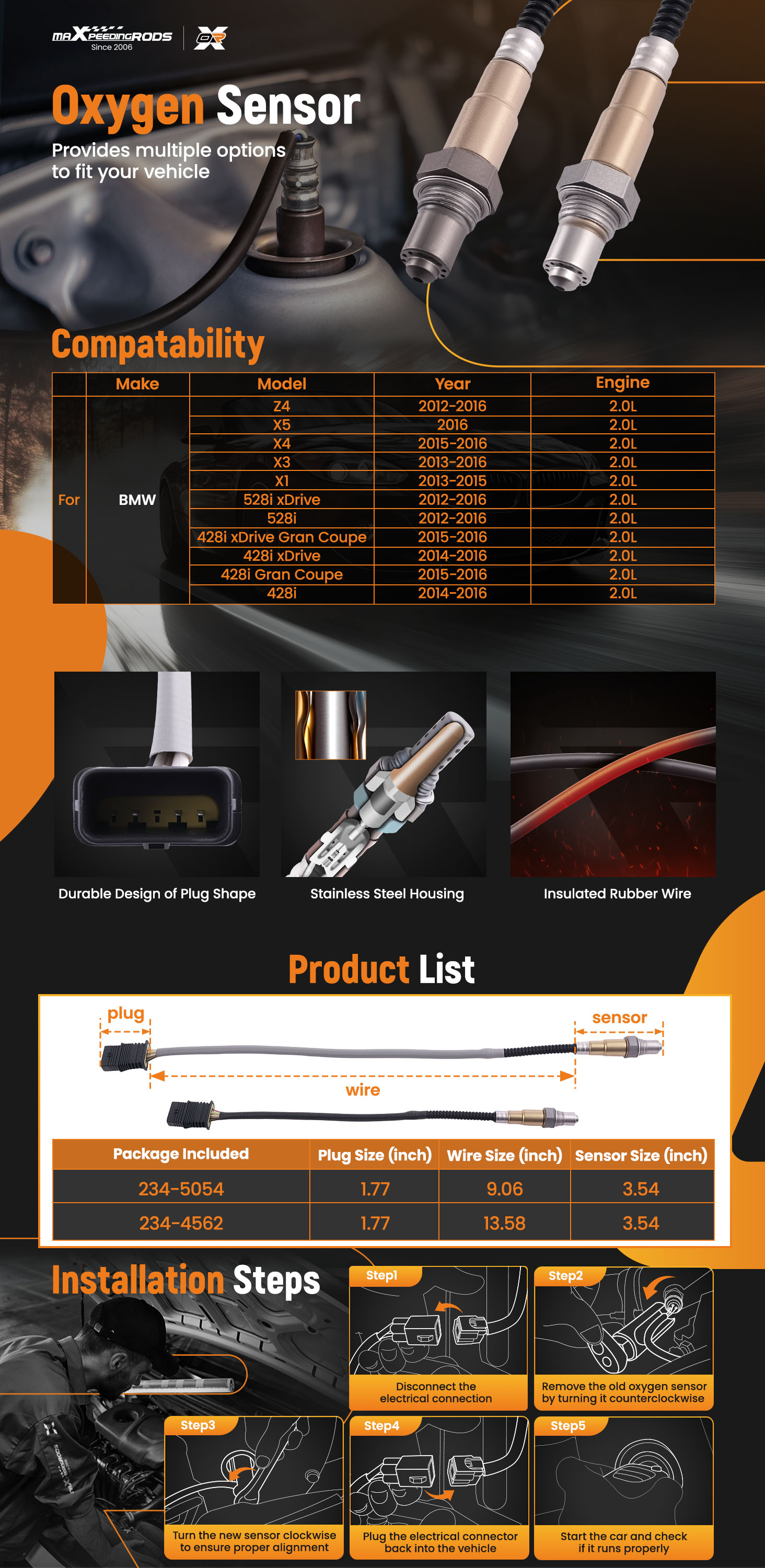【High Quality Mateial】The oxygen sensor is equipped with a stainless steel housing. Durable and corrosion-resistant, ensuring your engine's long-lasting and stable performance.