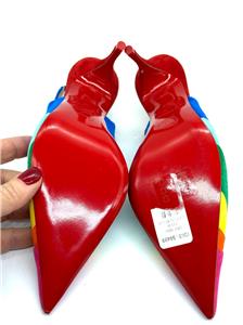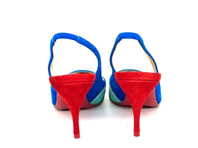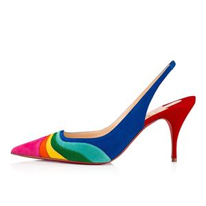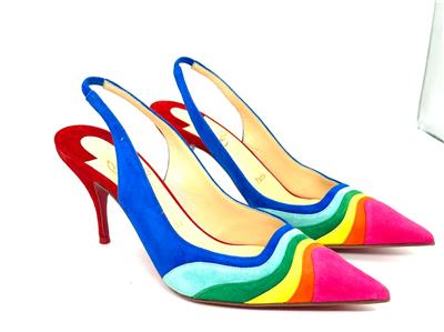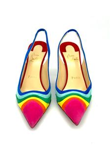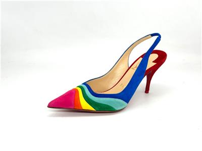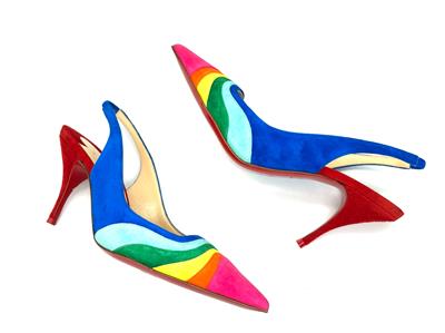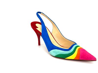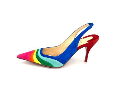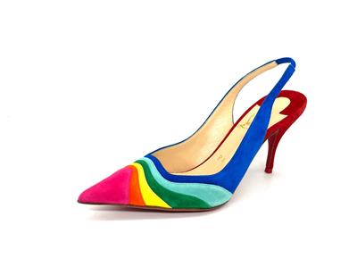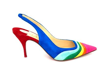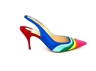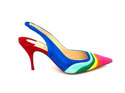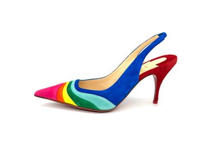 Christian Louboutin's statement 'Degradama' pumps are inspired by celebration. They've been made in Italy from panels of tactile suede in a rainbow palette and have a sharply pointed toe and elasticated slingback strap. The thin stiletto heel offers just the right amount of height.
