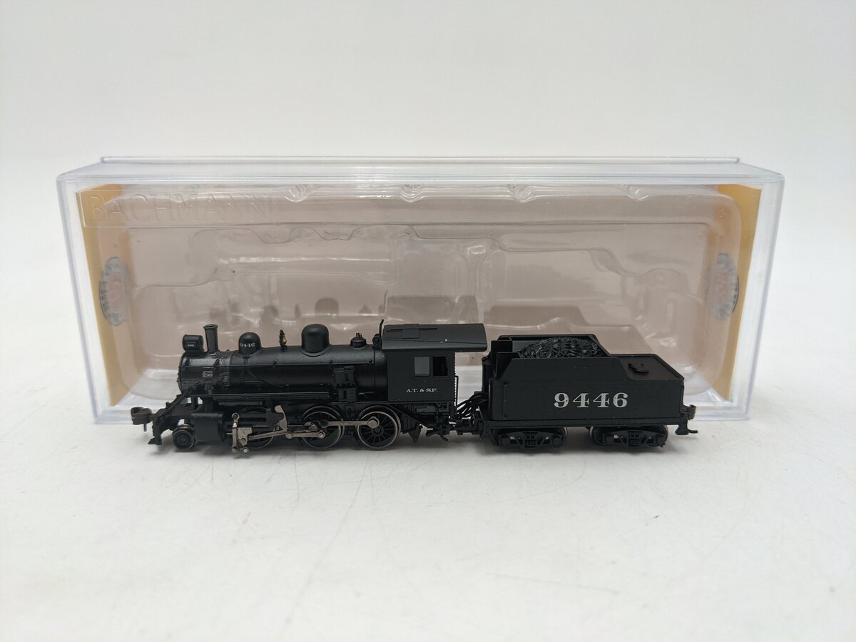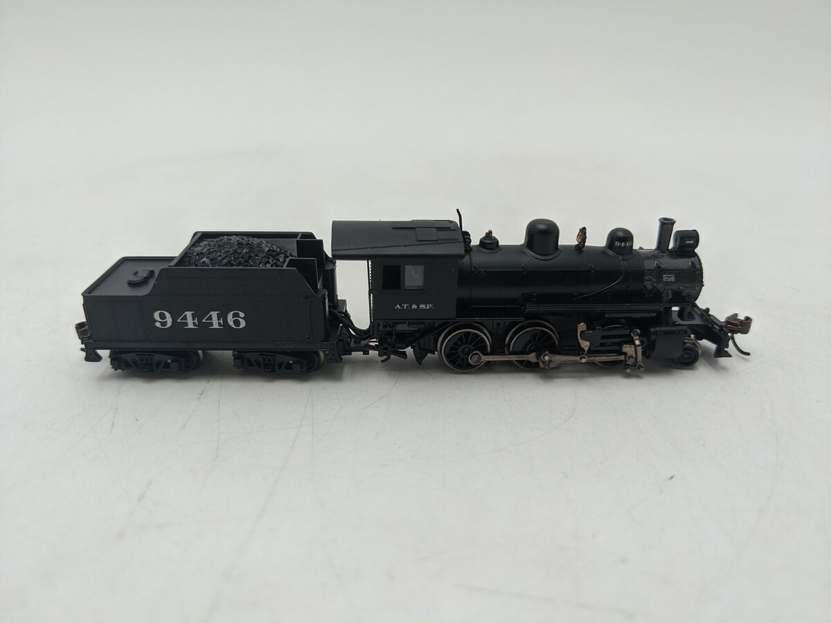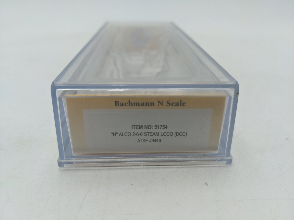 This is Bachmann 51754 N Santa Fe Alco 2-6-0 Steam Locomotive & Tender w/DCC #9446. Features includes DCC-equipped for speed, direction, and lighting, die-cast chassis, die-cast cylinders, metal valve gear and side rods, operating LED headlight and backup light, metal cut levers and handrails, metal wheels, front and rear E-Z mate mark II couplers, painted in color black.