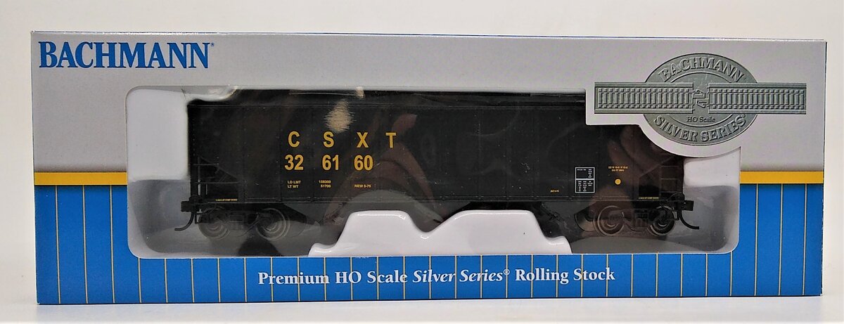 This is a Bachmann 18705 HO Scale CSX Beth Steel 100 Ton 3 Bay Hopper #326160. Silver Series® rolling stock features: blackened metal wheels, body mounted couplers & non-magnetic axles.