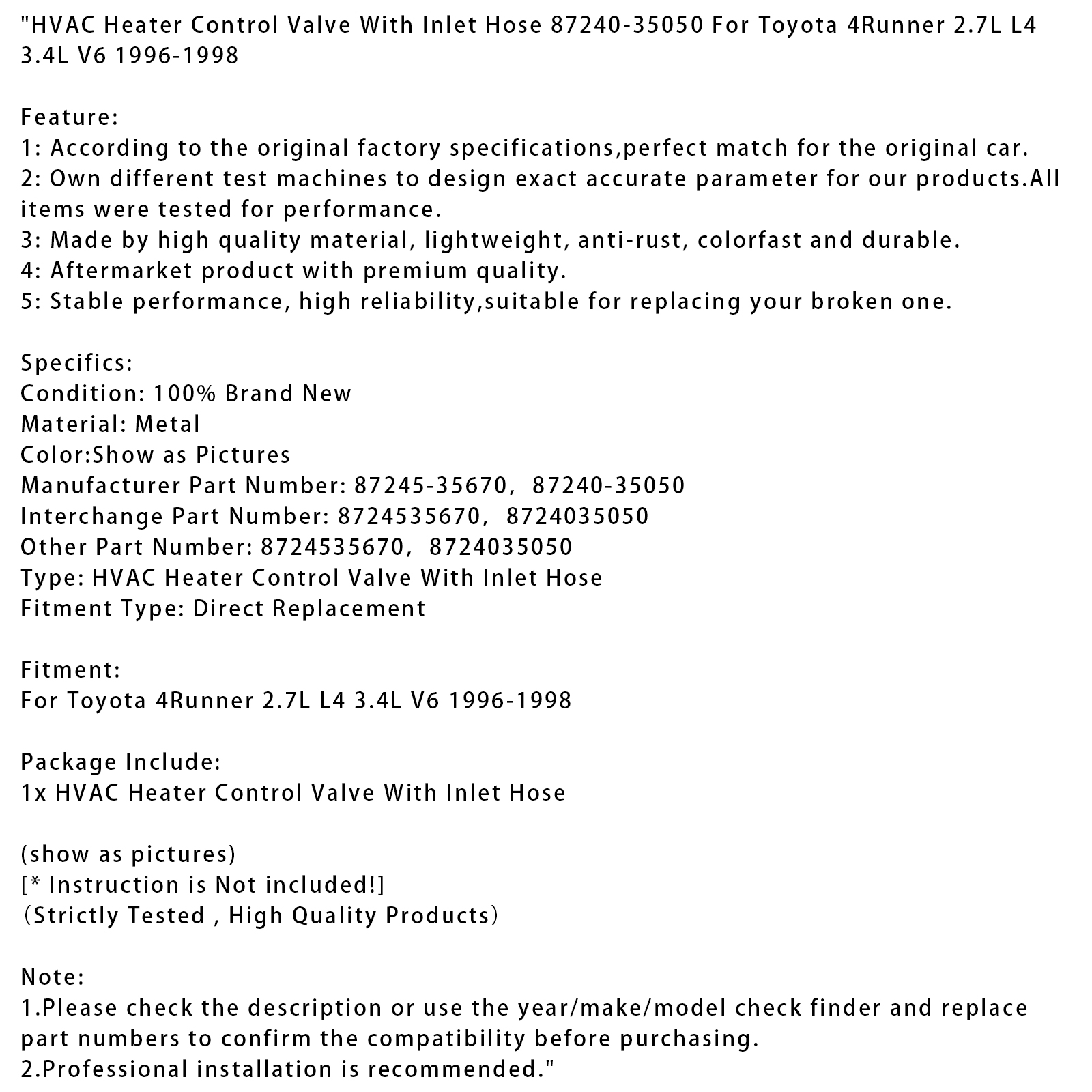 HVAC Heater Control Valve With Inlet Hose 87240-35050 For Toyota 4Runner 2.7L L4 3.4L V6 1996-1998