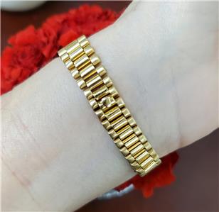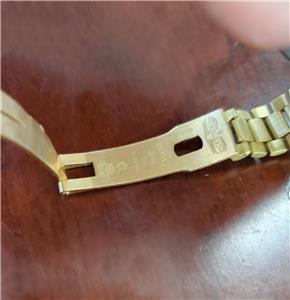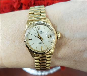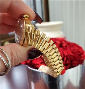 The watch features an acrylic crystal, consistent with its era, and is powered by a Rolex automatic self-winding movement. Its vintage charm and solid gold construction make it both a beautiful daily wearer and a collectible piece of Rolex history. The bracelet shows stretch from normal wear over time, as expected for a vintage President bracelet, but when properly sized it will still sit securely and comfortably on the wrist.