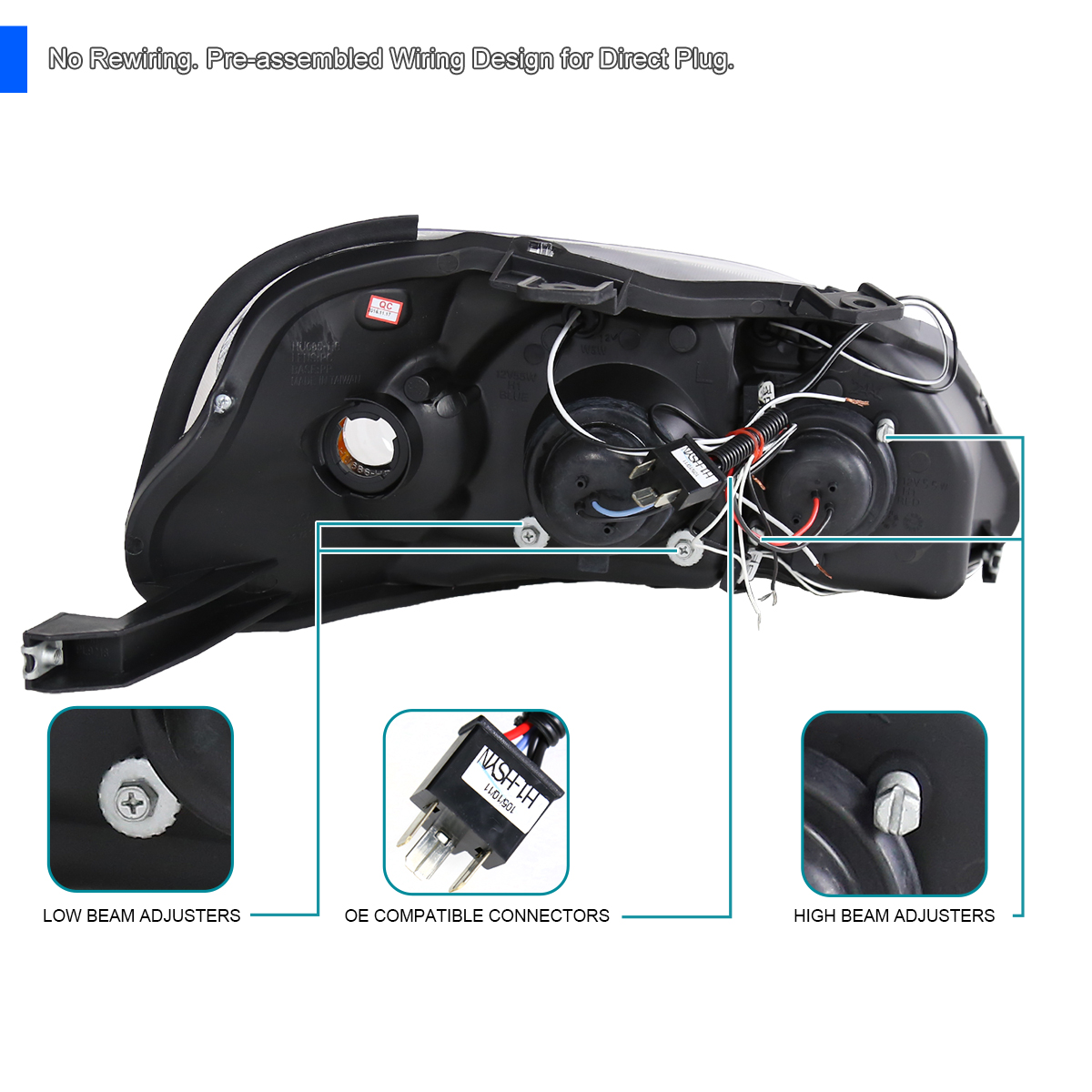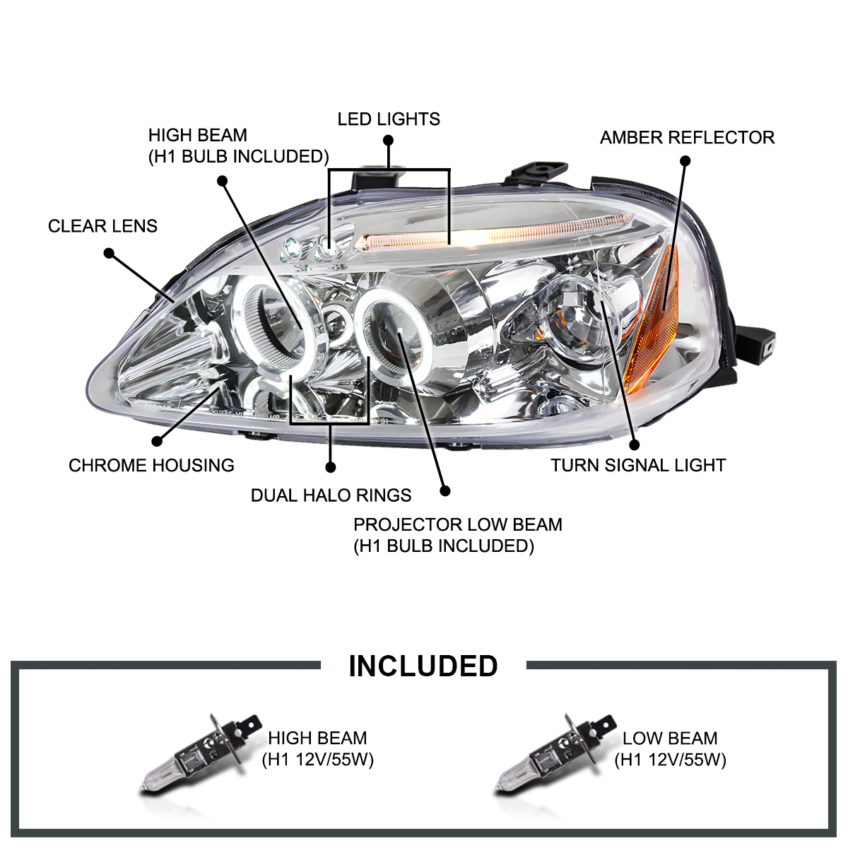 Brand new in original packaging. Exactly the same as shown in the picture! Comes with both headlights. H1 light bulbs included for HIGH/LOW beam. High quality chrome projector headlights w/ dual halo rings & LED lights. These lights are made by an OE approved and ISO certified manufacturer with the quality meet or exceed all OE standards. Do not come with installation instructions. Professional installation highly recommended. Fitment : 99-00 Honda Civic 2/3/4dr