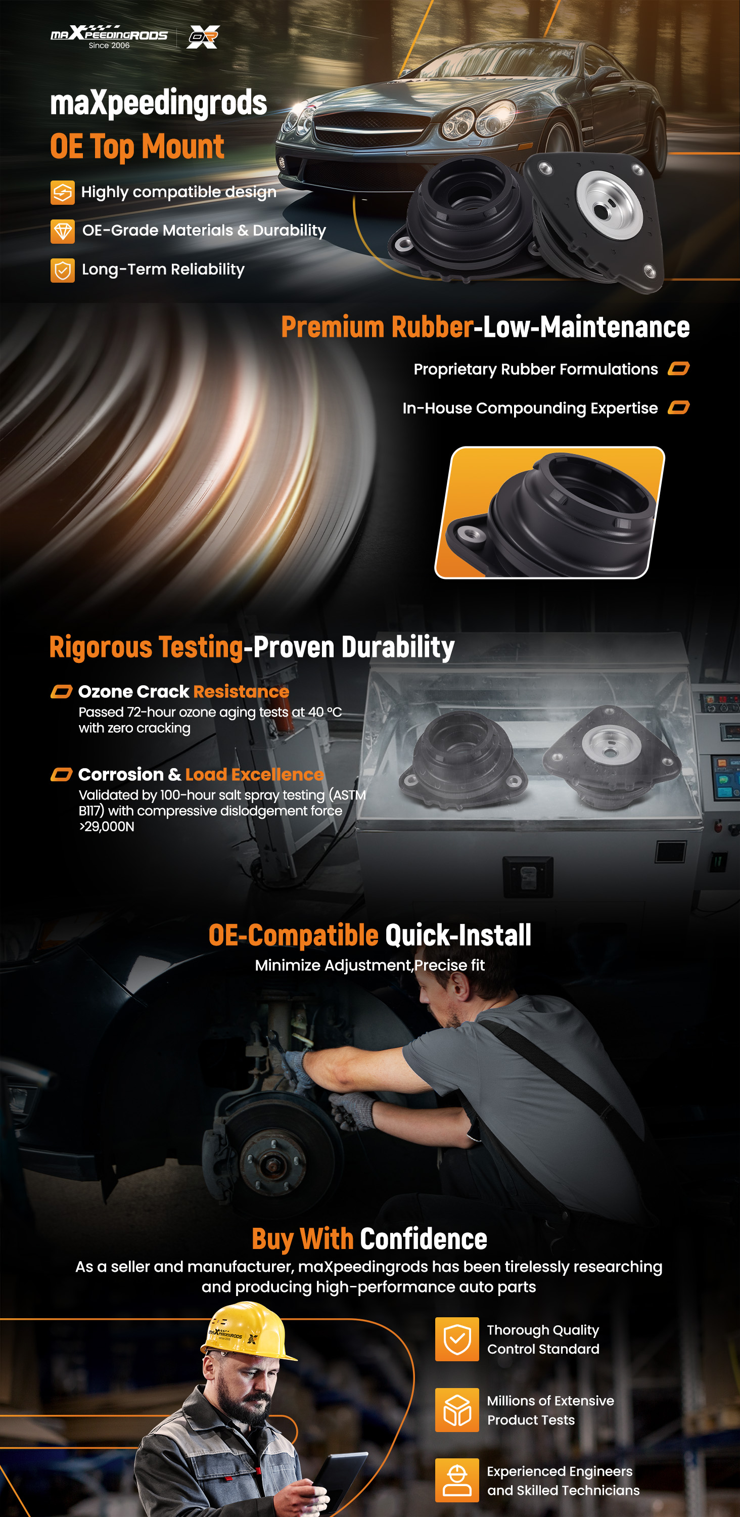 Entwickelt zur Verbesserung des Fahrkomforts, nutzt diese fortschrittliche Federungskomponente zertifizierte Hochleistungspolymere und eine mehrschichtige Dichtungsarchitektur. Validiert durch 100-Stunden ASTM B117 Salzsprühtest und Abzugsfestigkeitsprüfung von über 10.000N, gewährleistet dies eine präzise Integration zwischen Stoßdämpfern und Fahrzeugchassis, eliminiert NVH-Übertragung (Geräusche, Vibrationen, Rauheit), isoliert straßeninduzierte Stöße und verlängert die Lebensdauer des Federungssystems erheblich.