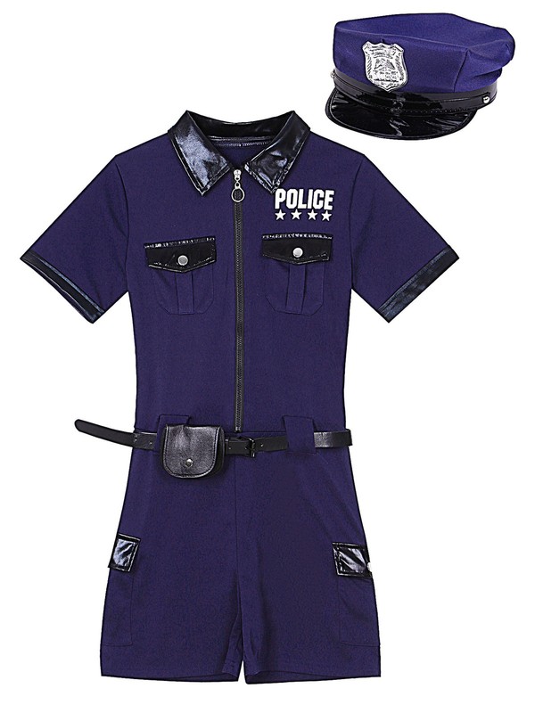 Policeman outfit includes jumpsuit, waist belt, hat, purse and cuffs, totally 5-piece per set.
