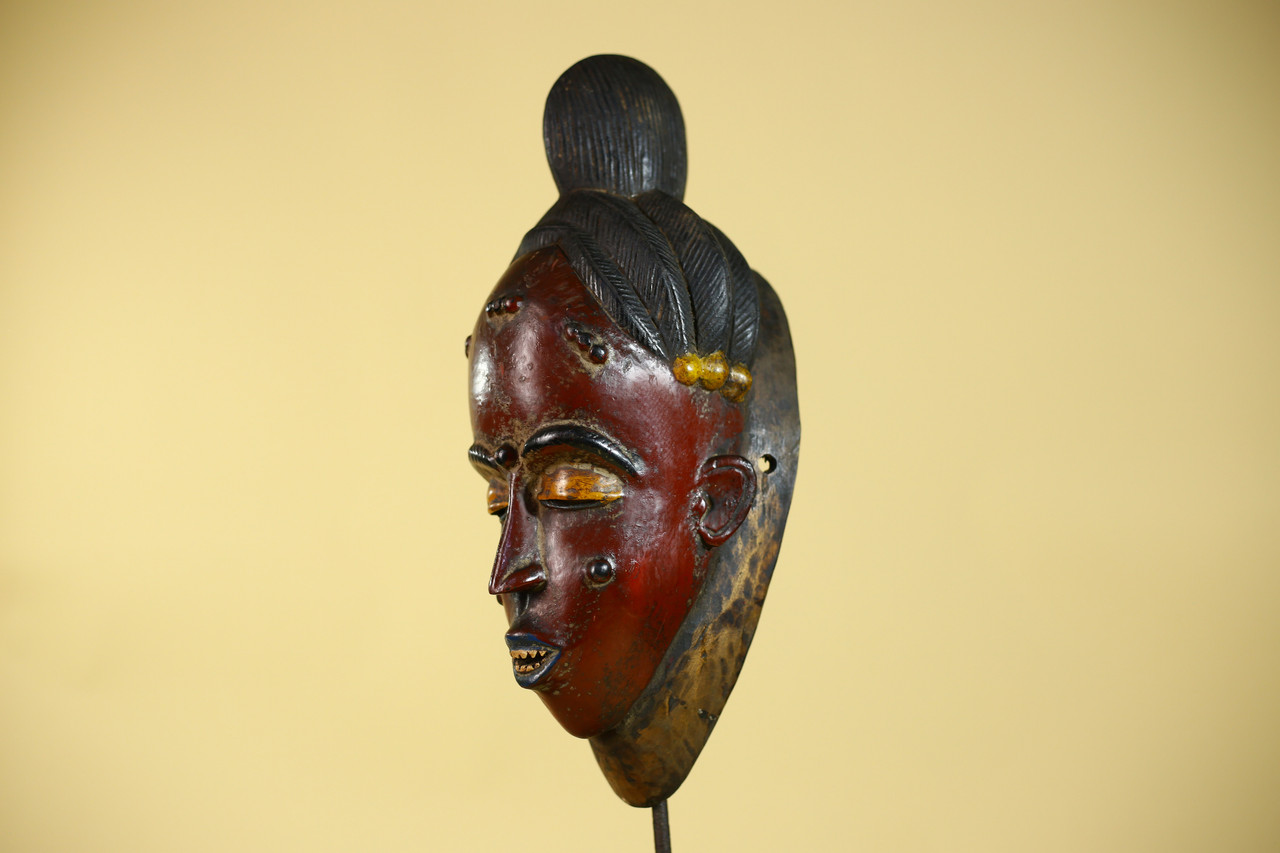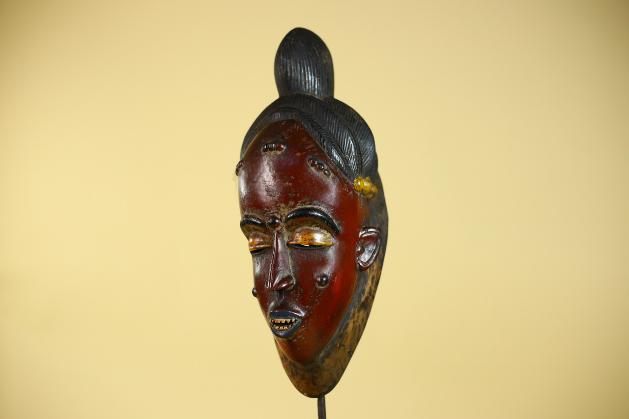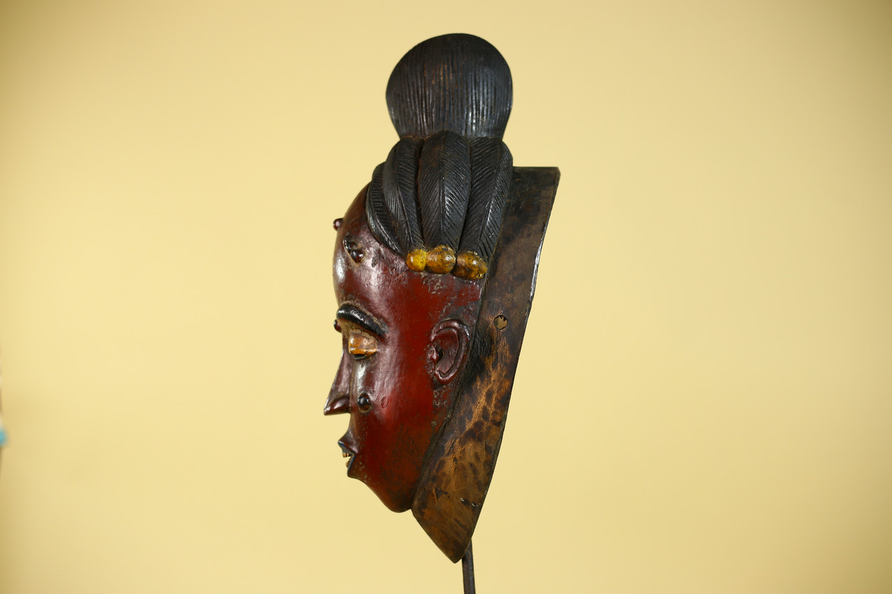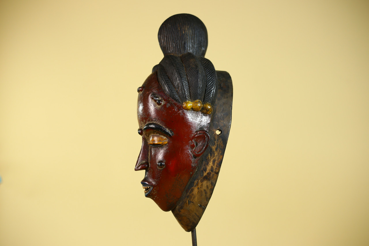 SIZE(CM): 39/14.5/14 Authentic hand-carved Baule portrait mask originating from Côte d’Ivoire, West Africa. Baule carving traditions are widely recognized for their refined facial symmetry, calm expression, and stylized representation of idealized beauty associated with ceremonial and cultural performances. This example displays classic Baule characteristics including elongated facial proportions, carefully carved coiffure, and balanced facial detailing. The deep reddish-brown surface with contrasting pigment accents shows natural aging and tonal variation developed over time, contributing to its authentic ethnographic presence. The reverse reveals traditional hollowed carving techniques confirming hand craftsmanship. Surface patina, minor abrasions, and pigment wear are consistent with age and handling, enhancing the collectible character valued by collectors of African tribal art. Approximate size: 39 × 14.5 × 14 cm Stand not included.