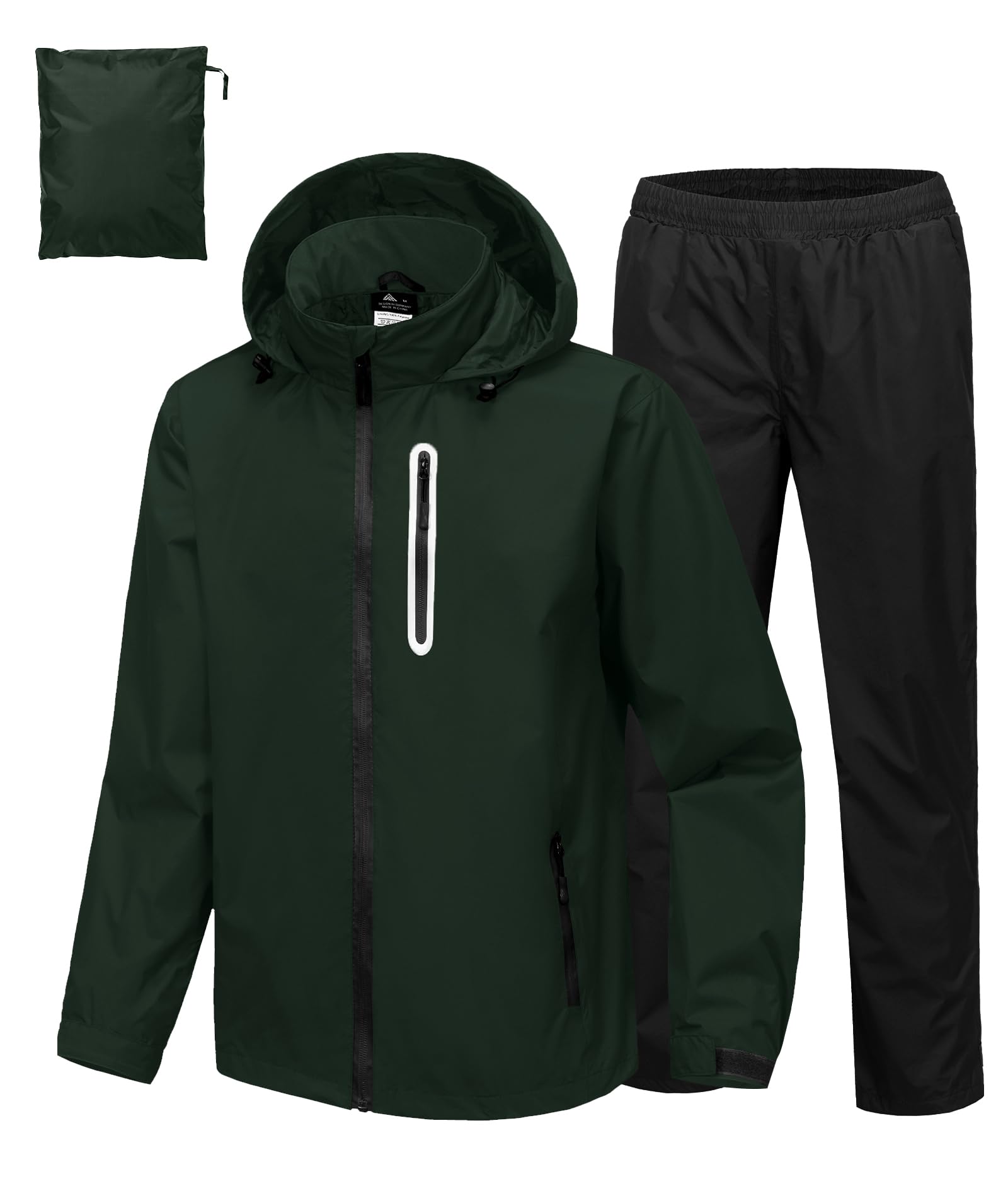 【Innovative Functional Adjustment】Swisswell mens women rain jacket waterproof with hood features a concealable hood that can be rolled into the collar using the velcro underneath the collar. Also it have more velcros to tighten the cuffs and leg opening to prevent water and cold. The jacket have 1 chest waterproof zipper pocket and 2 side waterproof zipper pockets to store your phone or wallet essentials, pants have 2 non-zippered pockets provide extra storage space