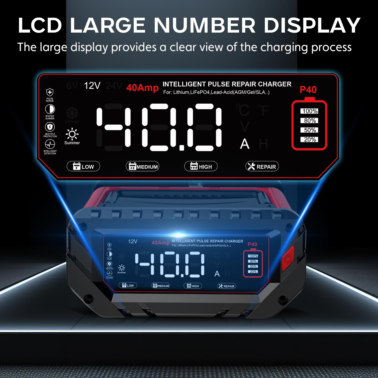 【Visualizzazione intelligente】 Caricabatterie per auto con un clic per attivare quattro modalità. Con schermo LCD che mostra la tensione della batteria, la corrente di carica, la temperatura di carica, il carico di corrente, ecc. Attiva automaticamente la modalità estiva e invernale per adattarsi alla temperatura ambiente e raggiungere il livello di carica ottimale.